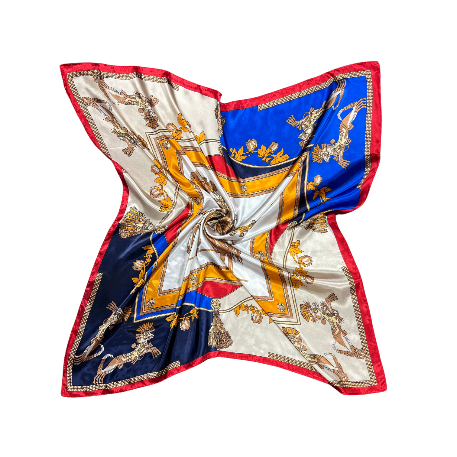 Beautiful silk touch satin square scarf with armed horse print. The scarf can be worn around the neck, head, and shoulder.