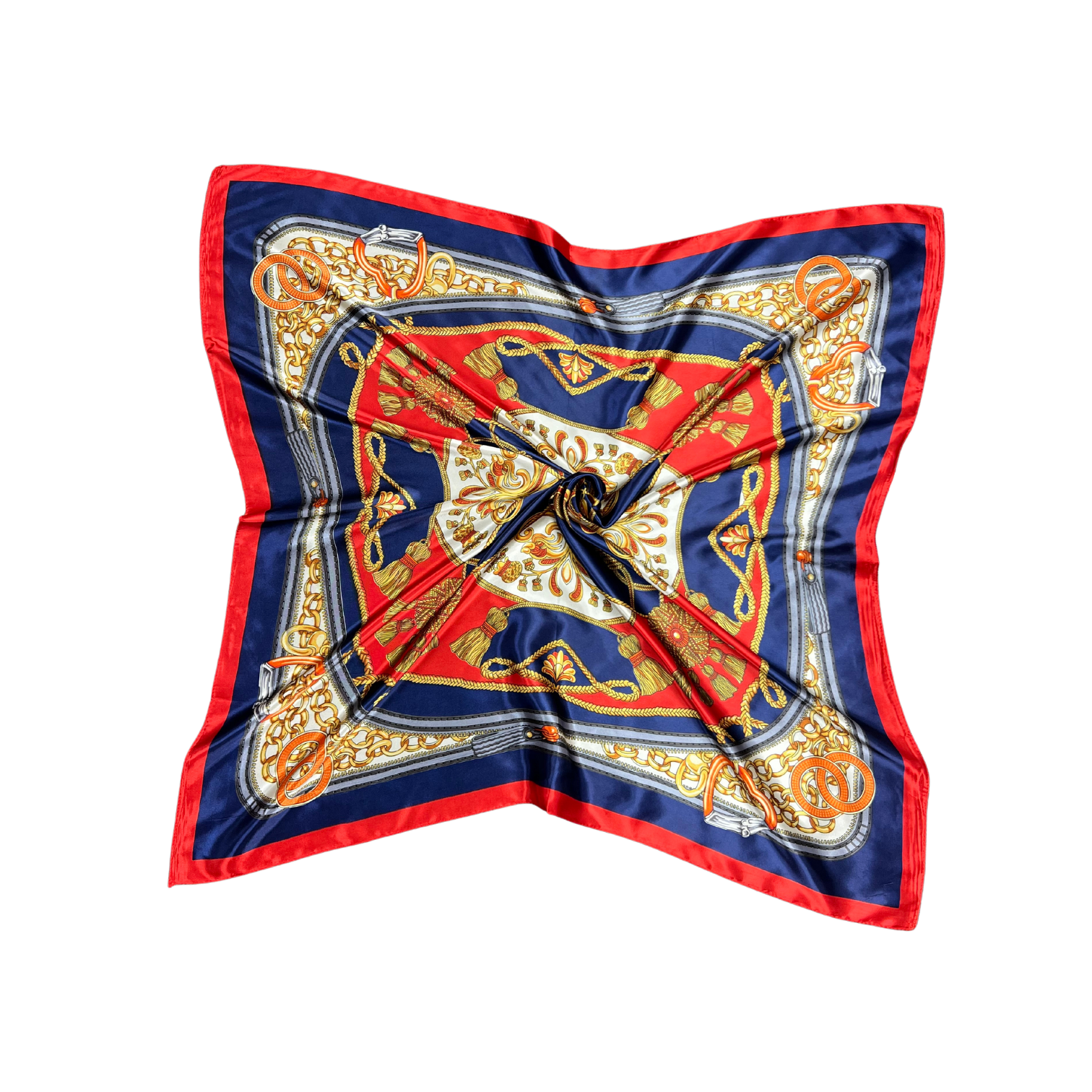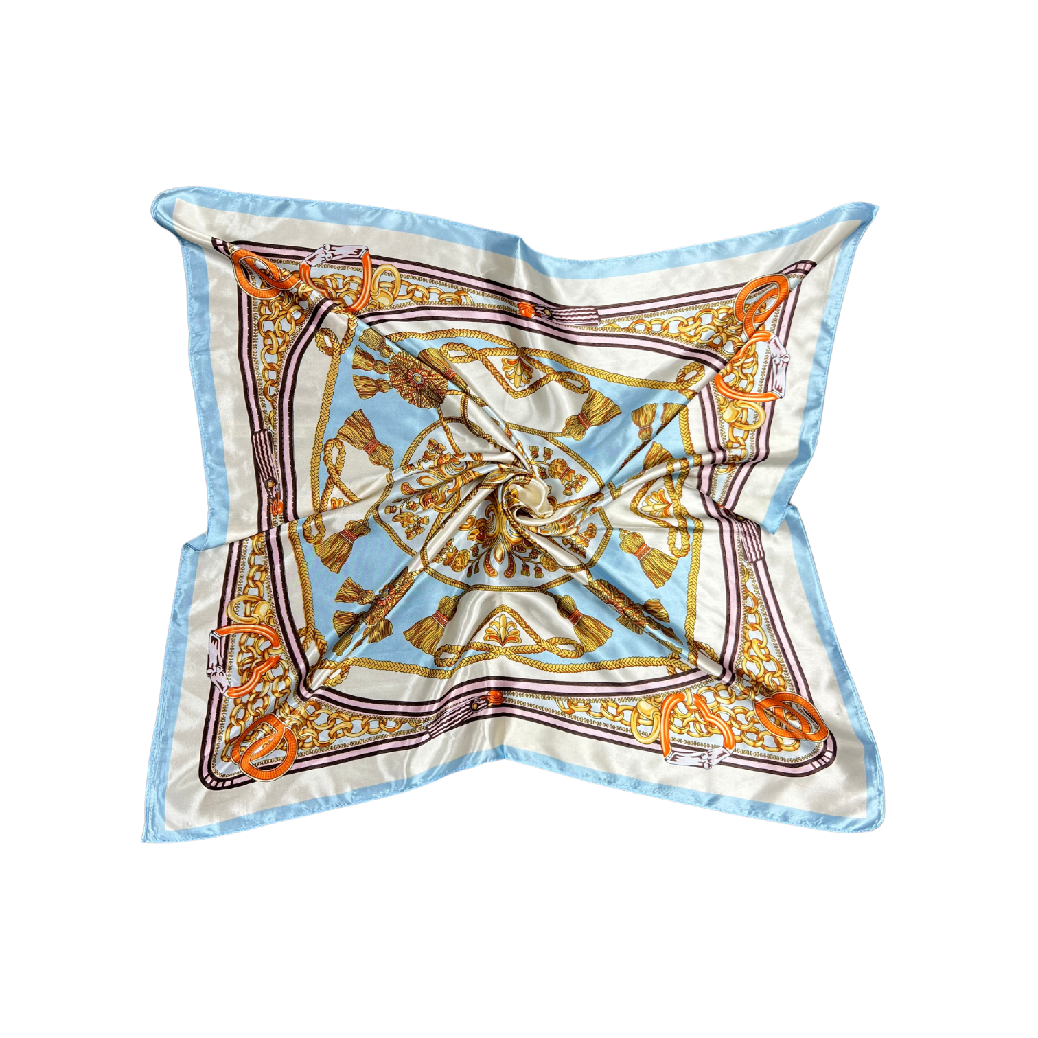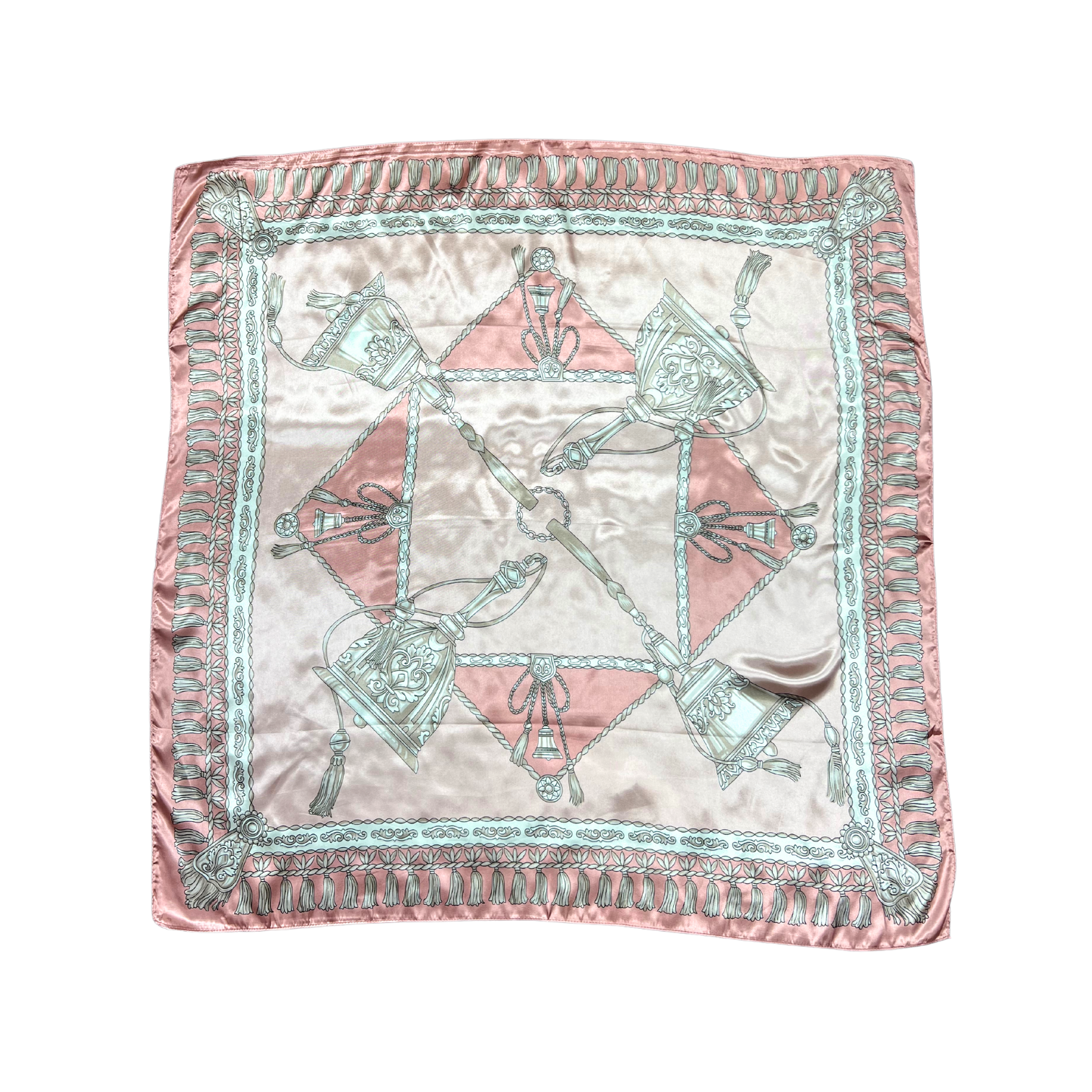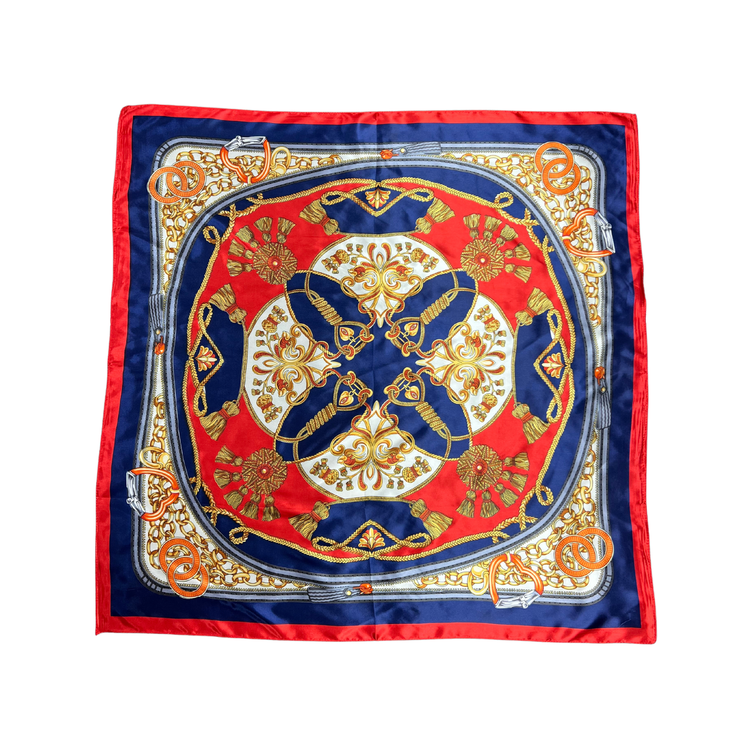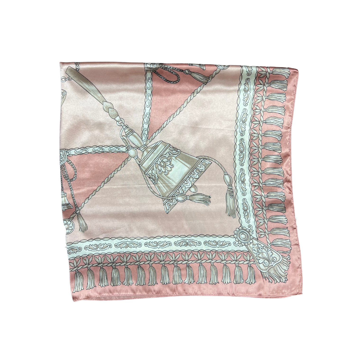 Beautiful silk touch satin square scarf with bell print. The scarf can be worn around the neck, head, and shoulder.