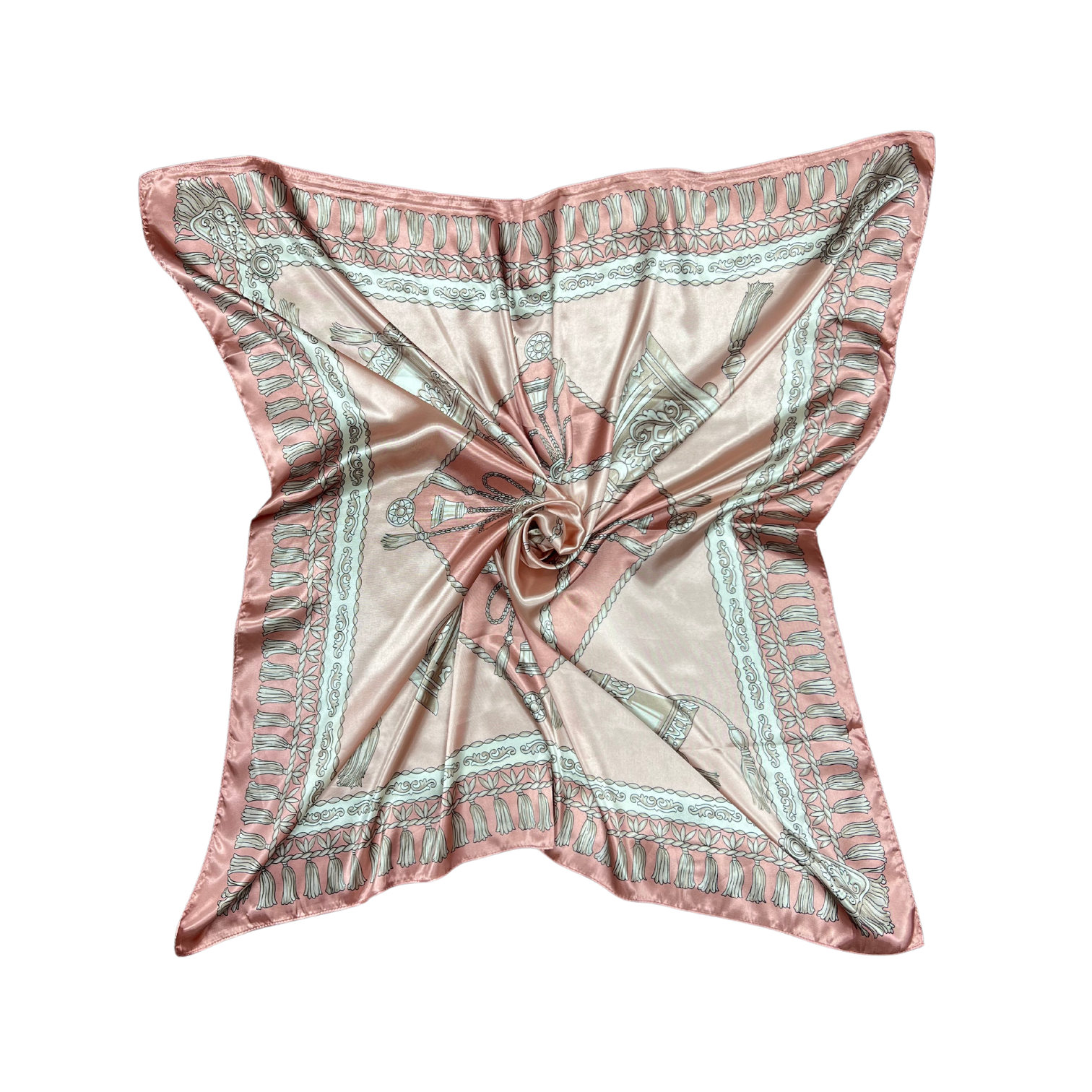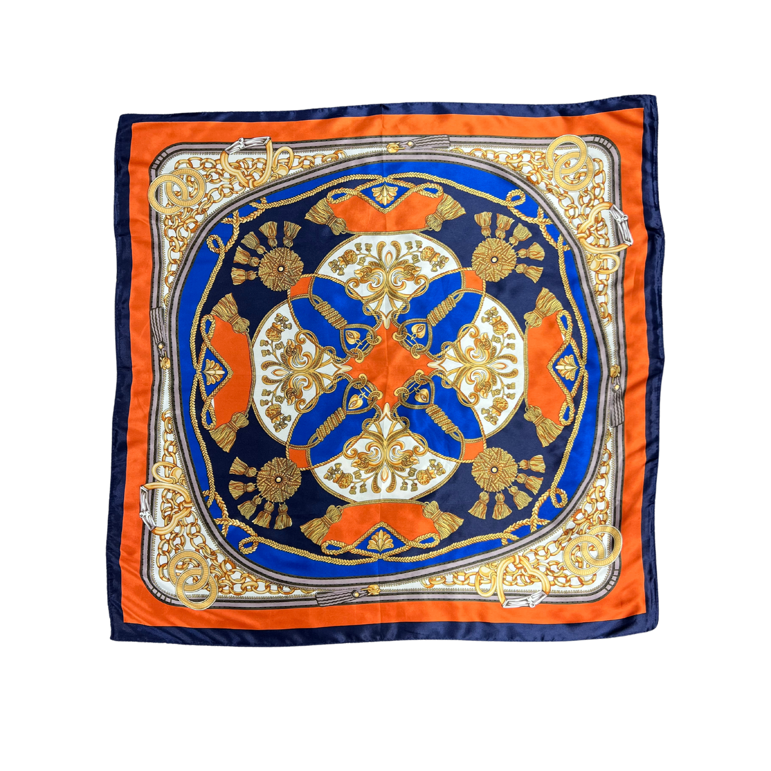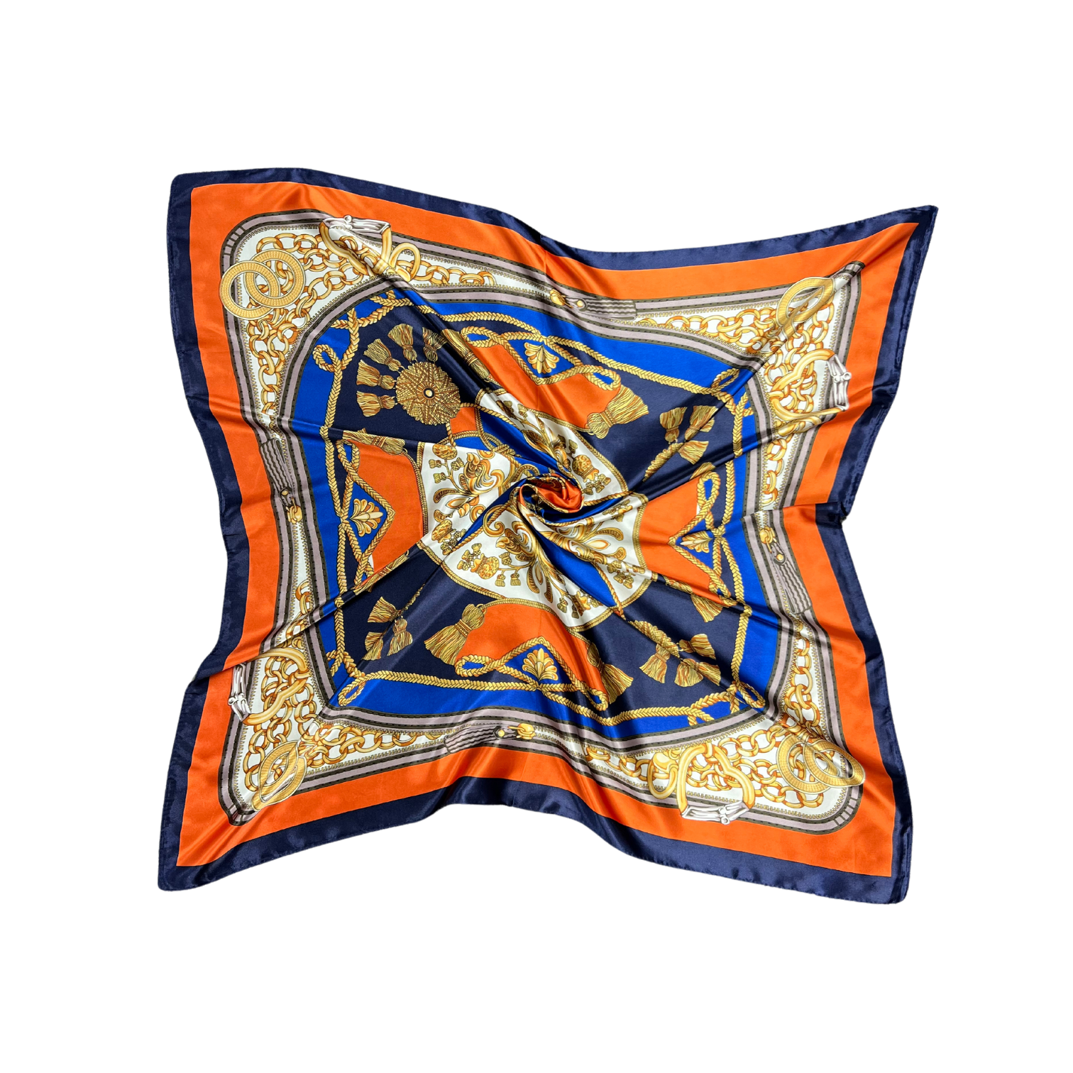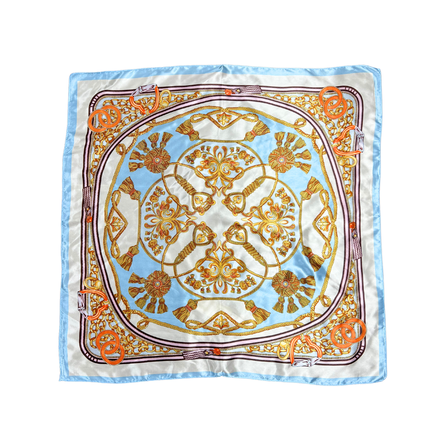 Beautiful silk touch satin square scarf with bell print. The scarf can be worn around the neck, head, and shoulder.
