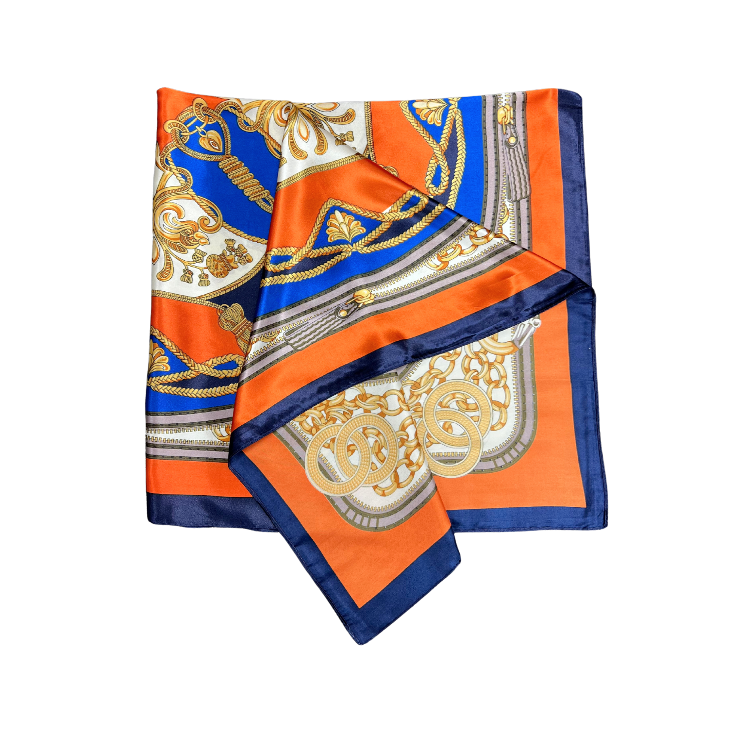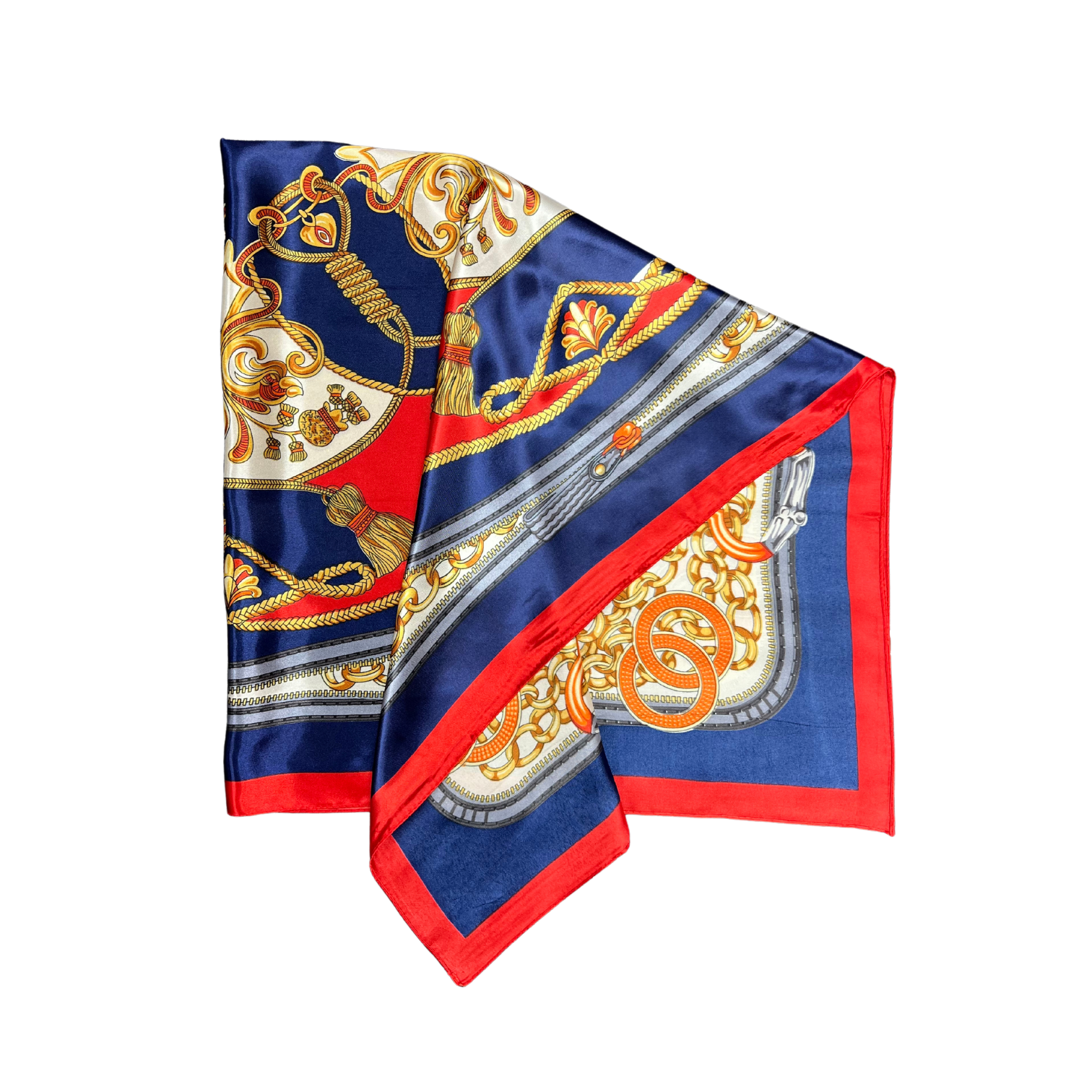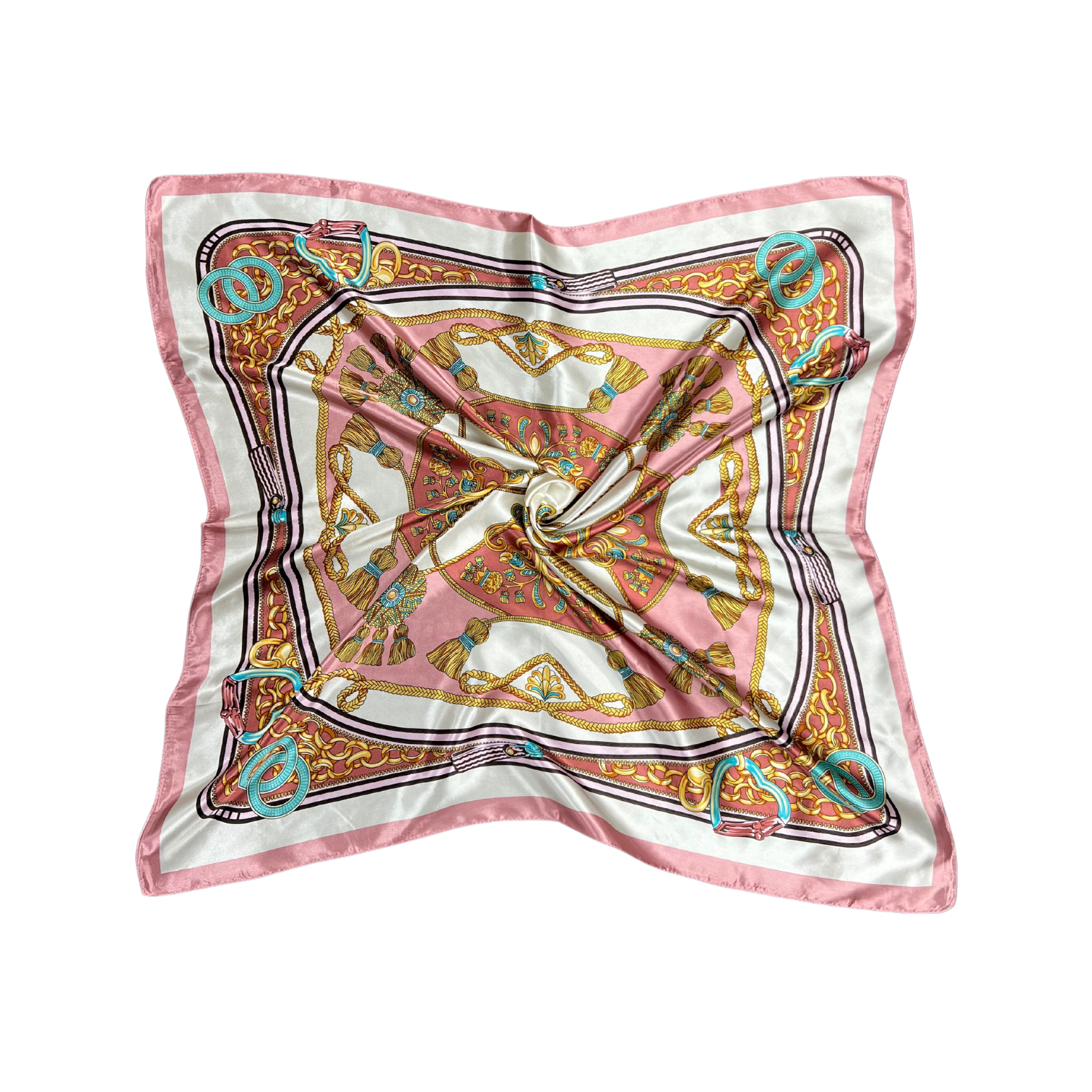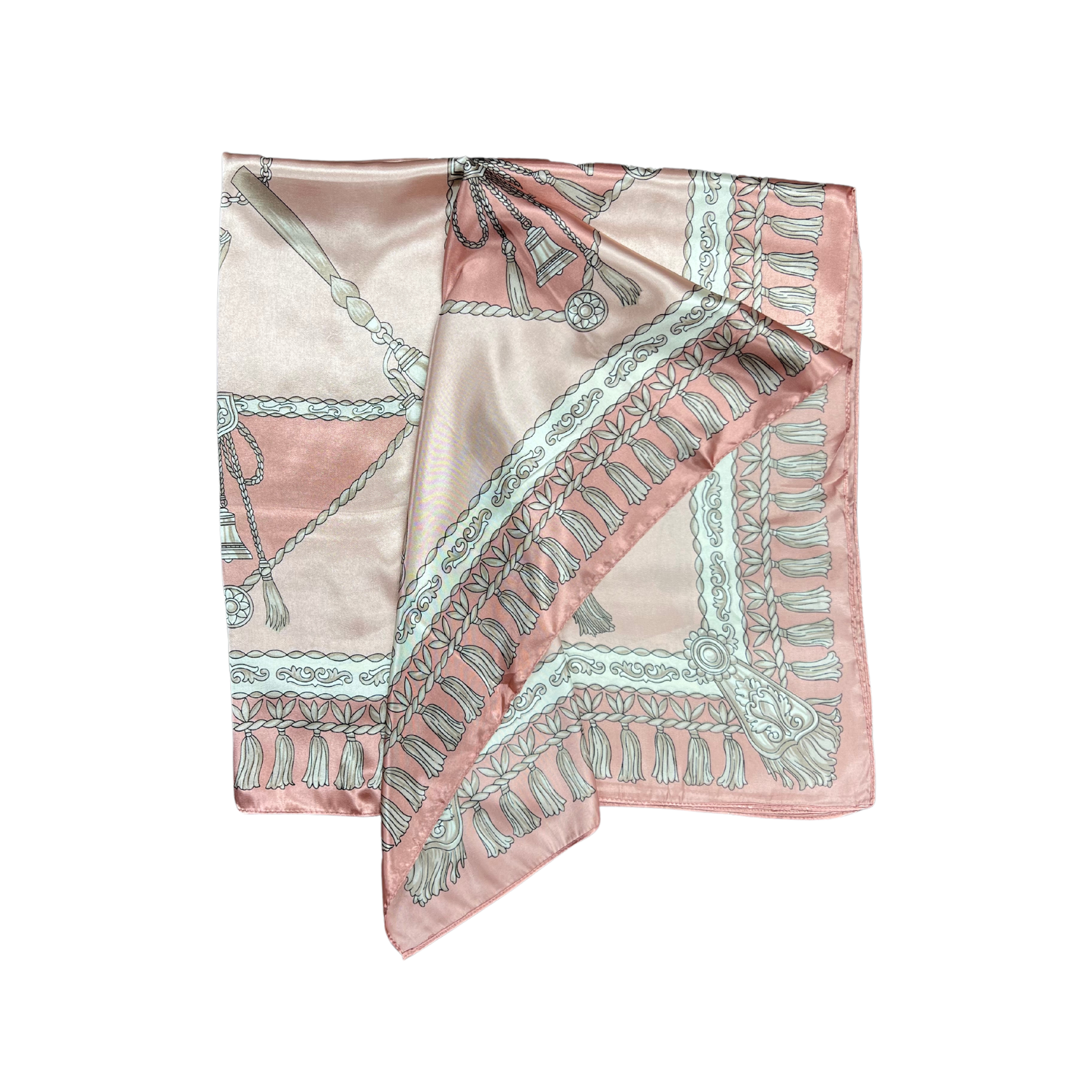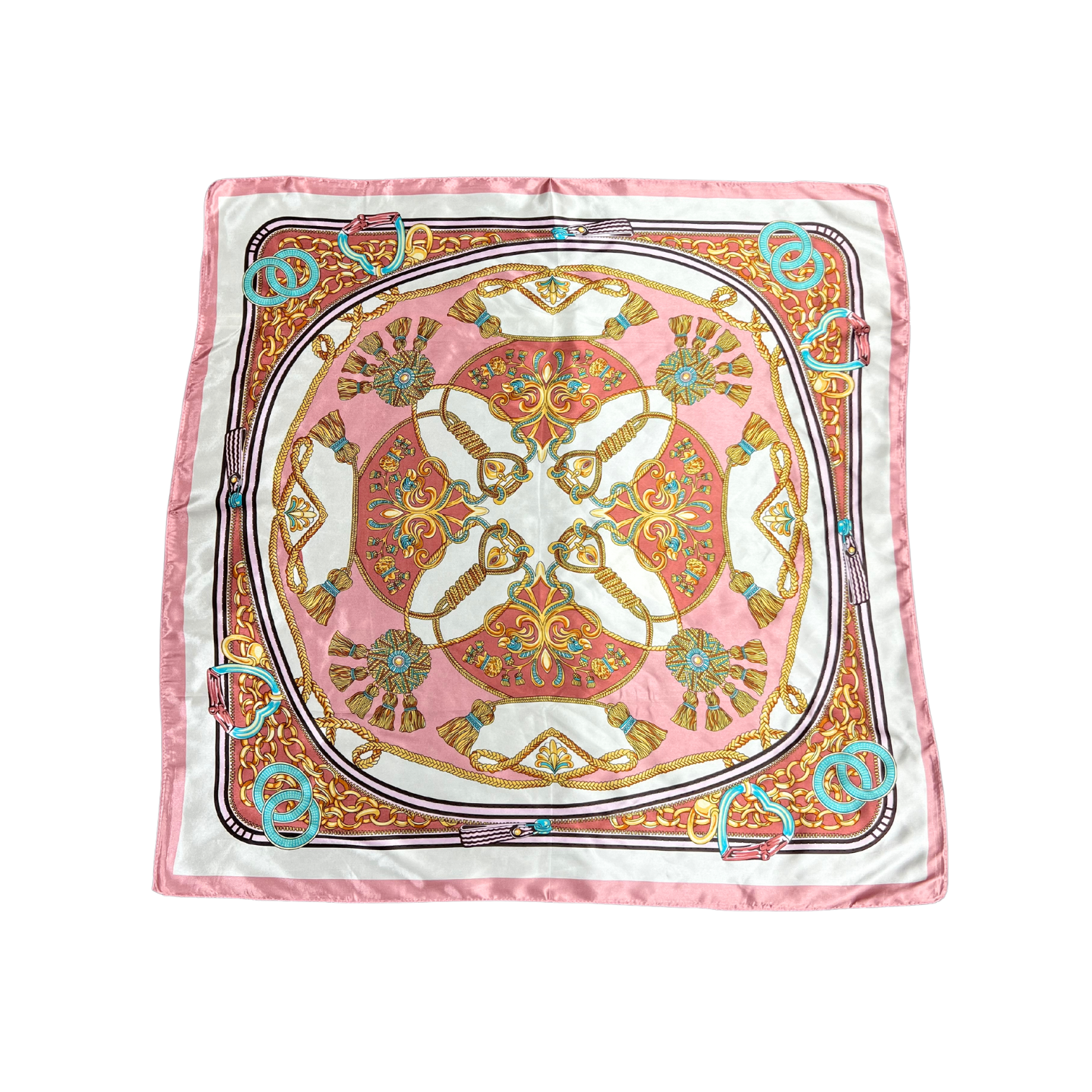 Beautiful silk touch satin square scarf with bell print. The scarf can be worn around the neck, head, and shoulder.