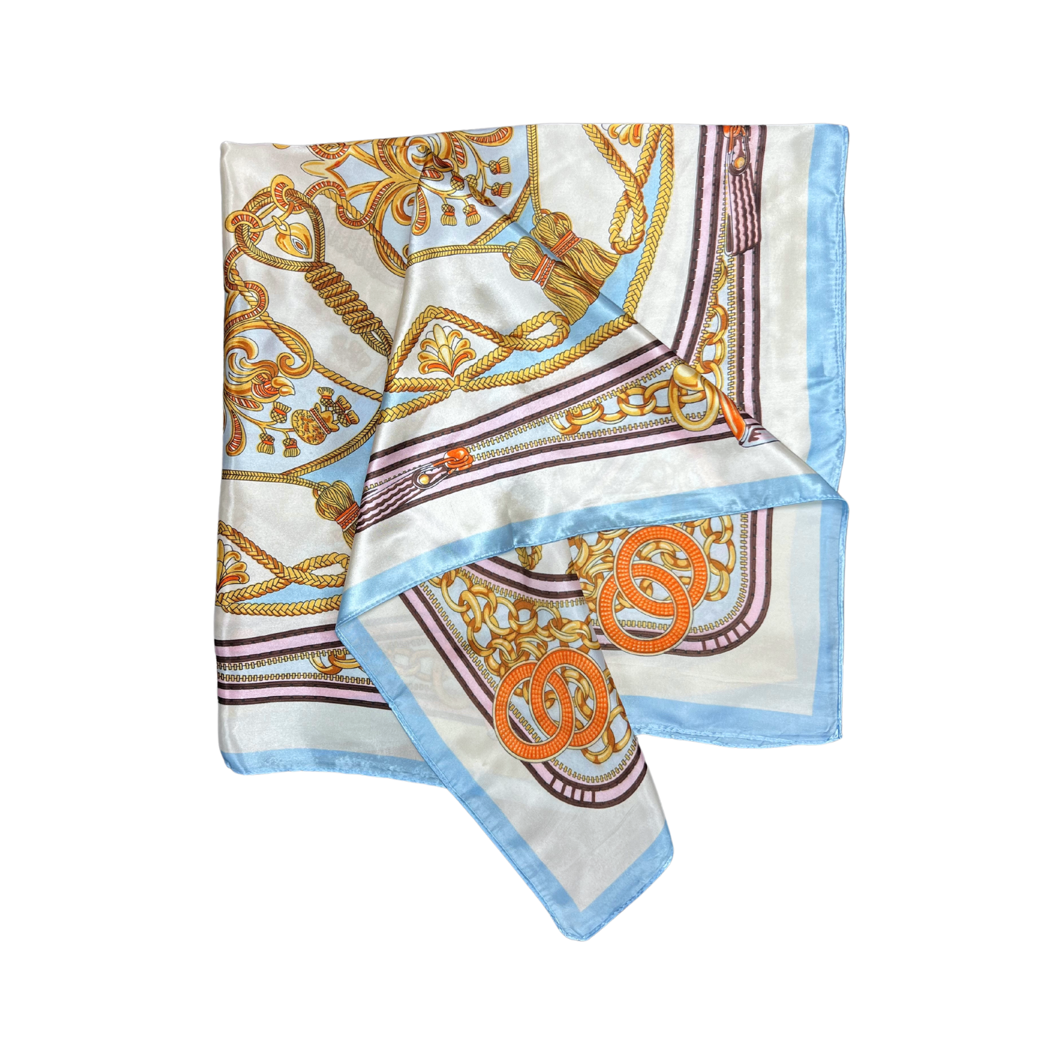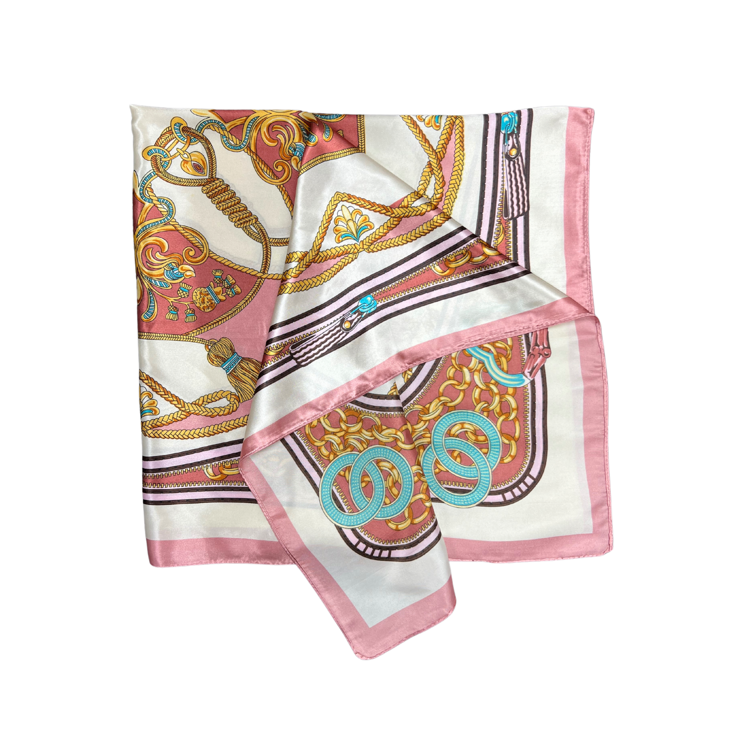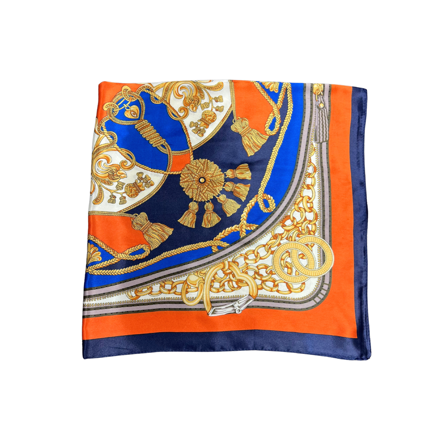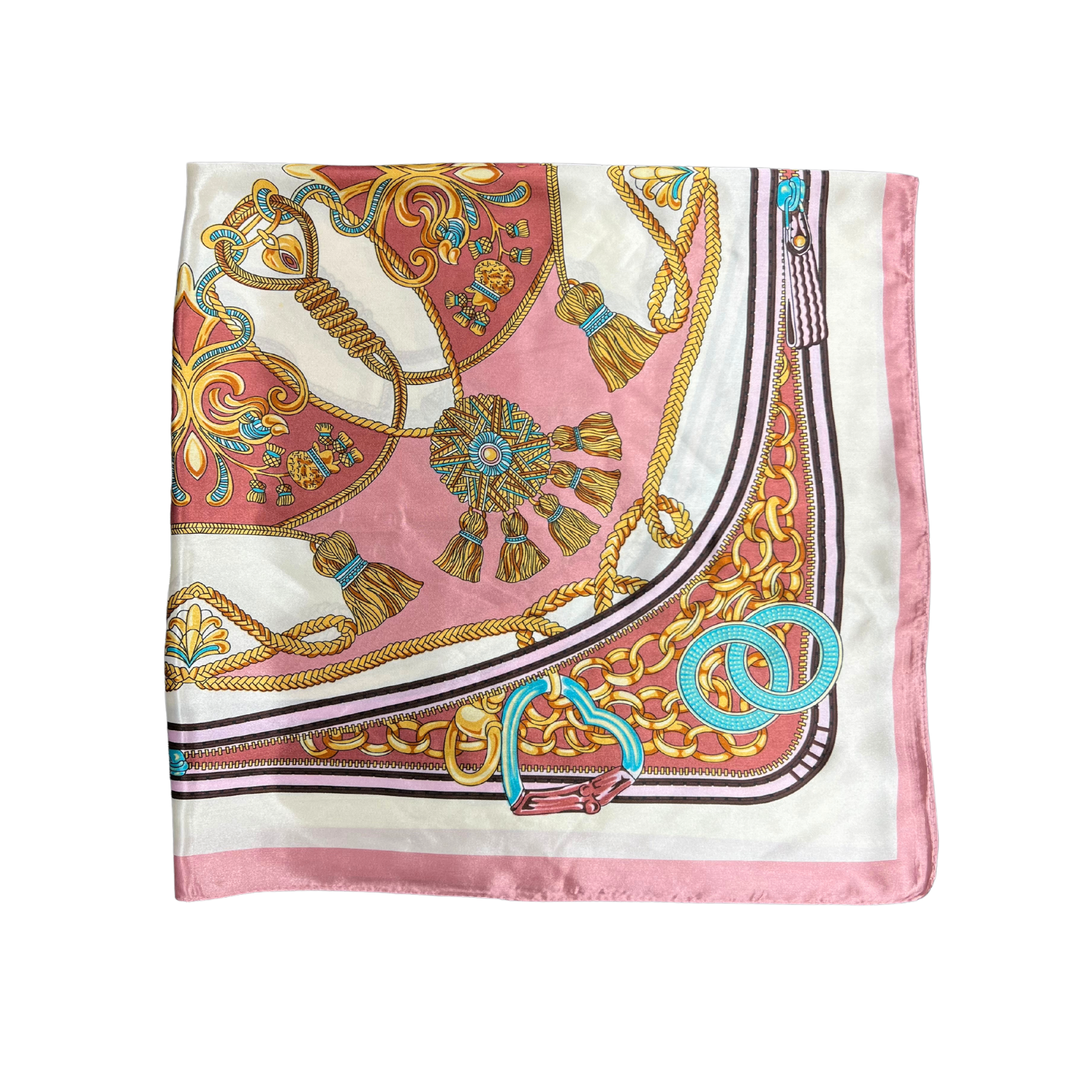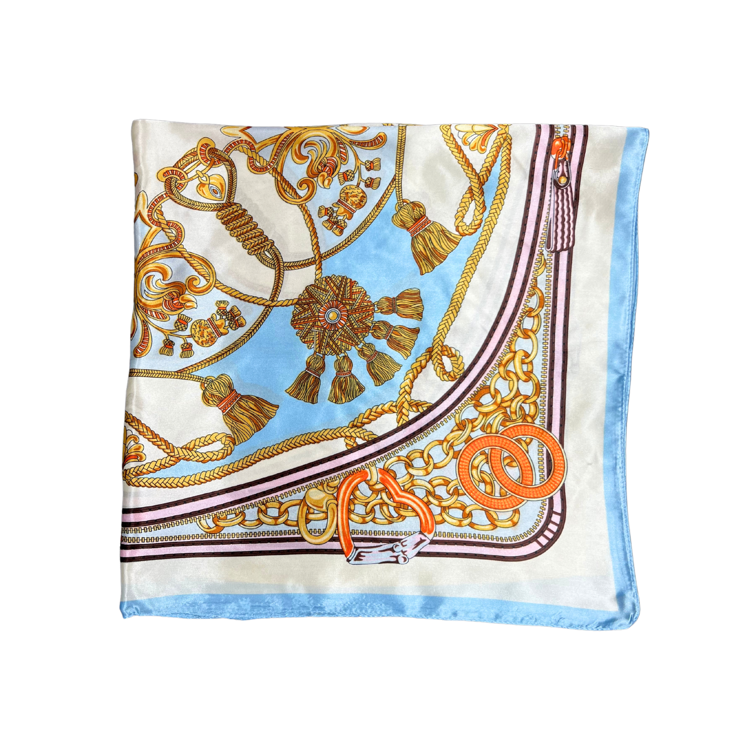 Beautiful silk touch satin square scarf with bell print. The scarf can be worn around the neck, head, and shoulder.