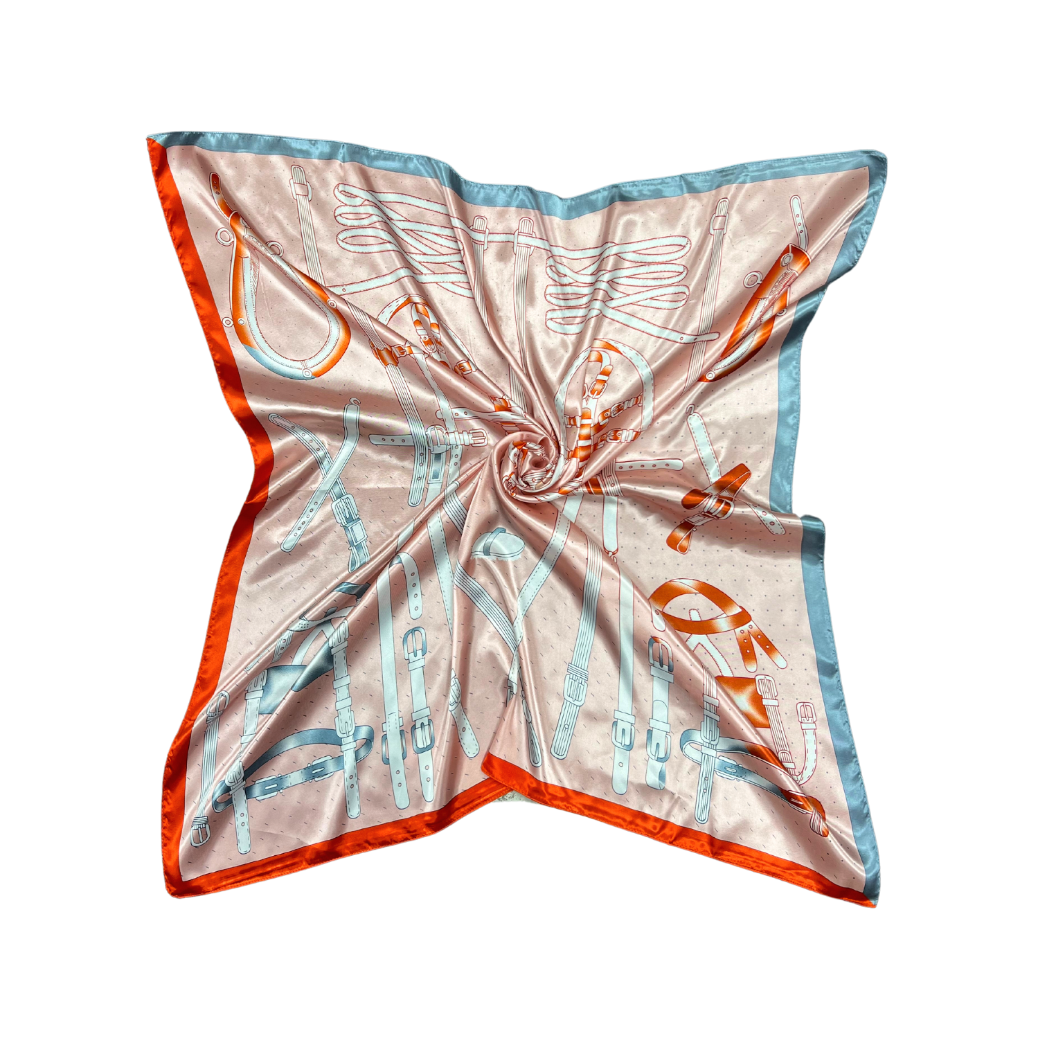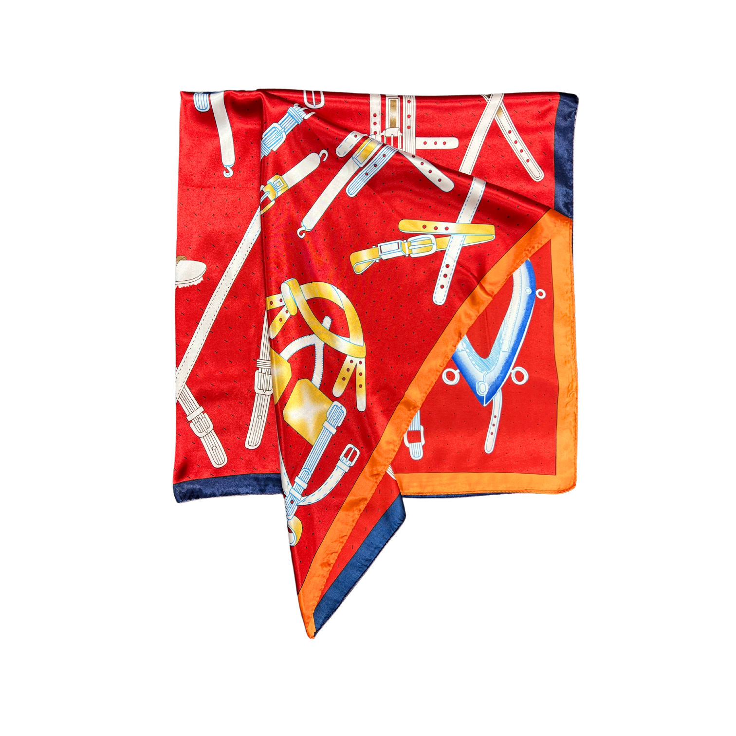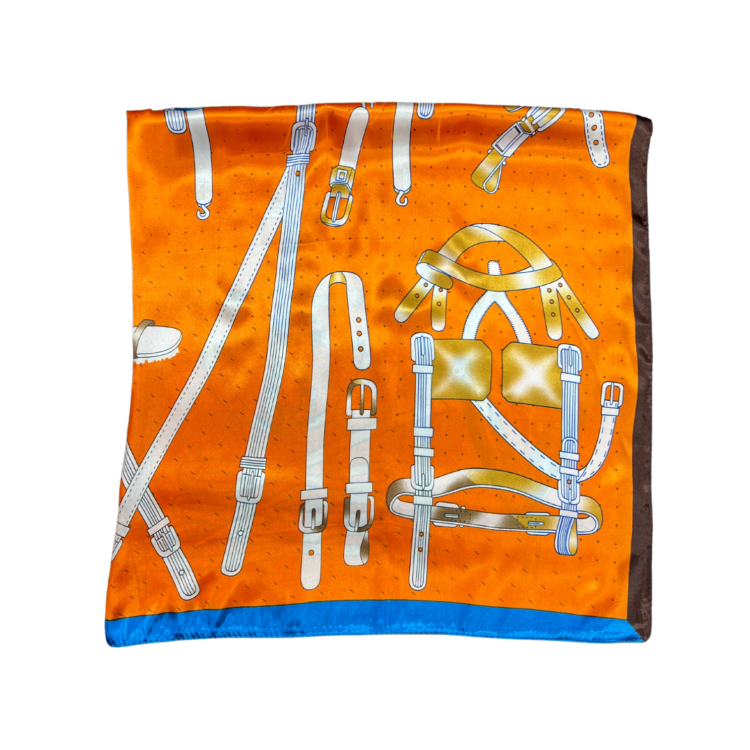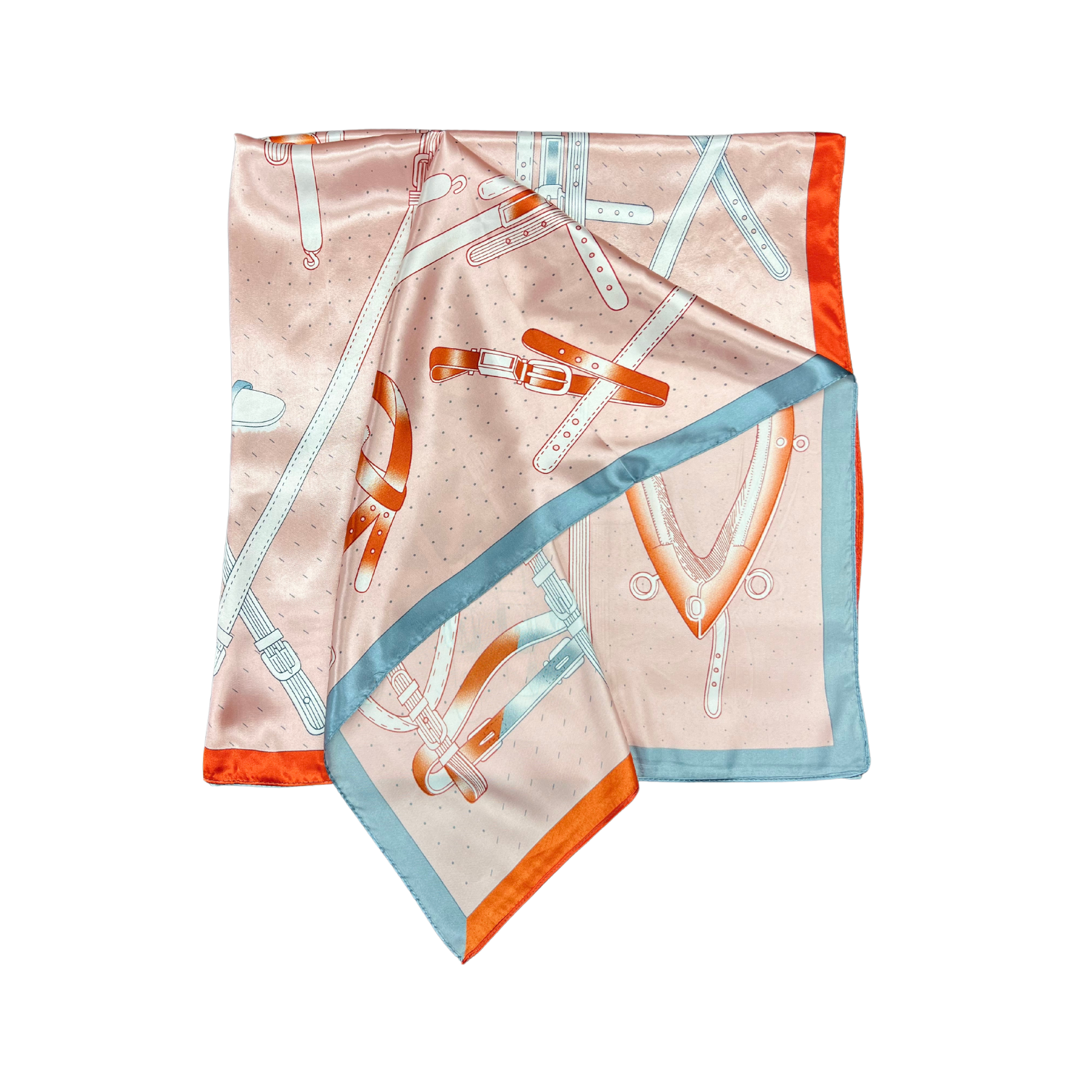 Beautiful silk touch satin square scarf with belt print. The scarf can be worn around the neck, head, and shoulder.
