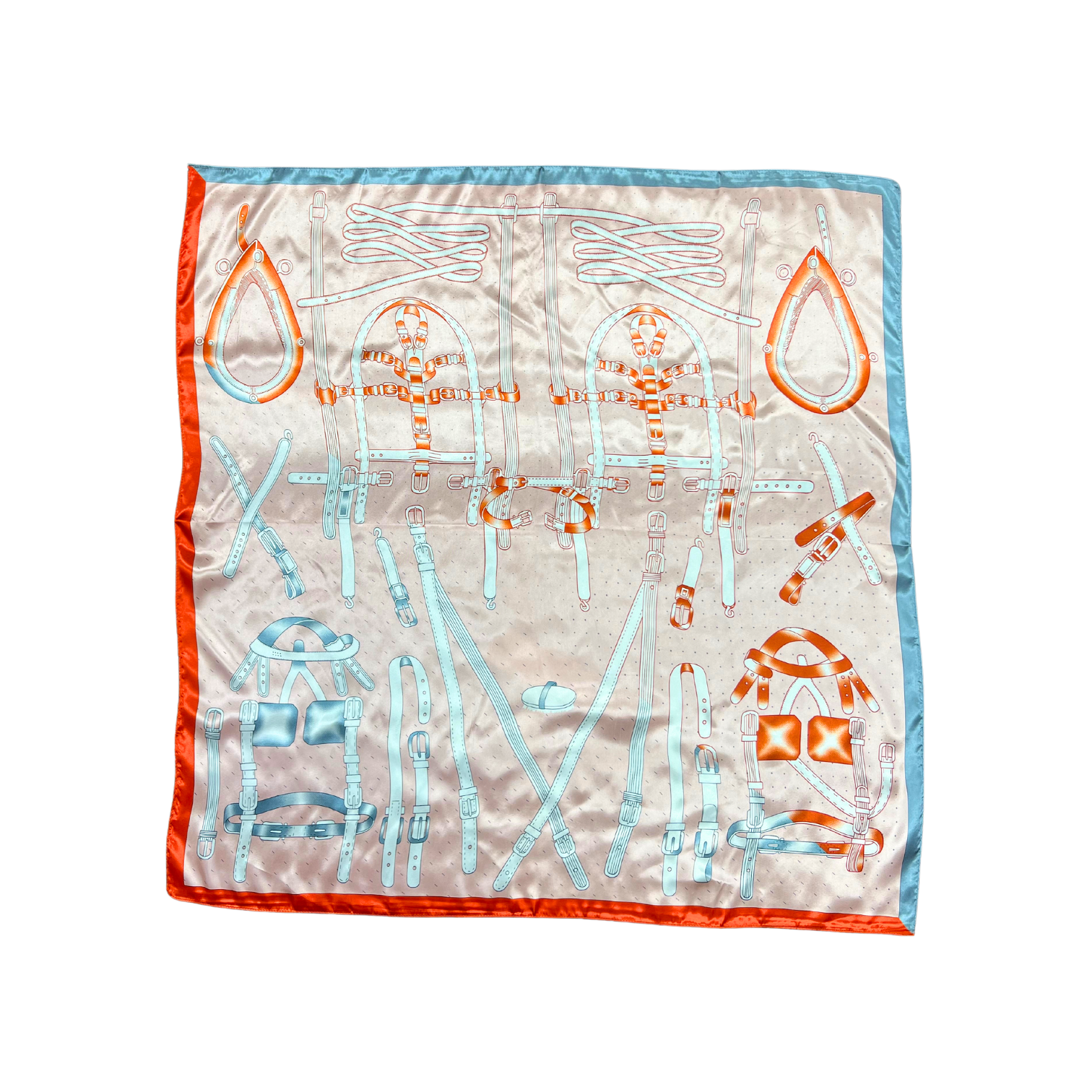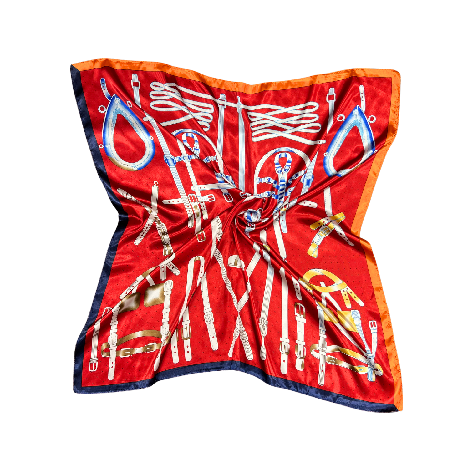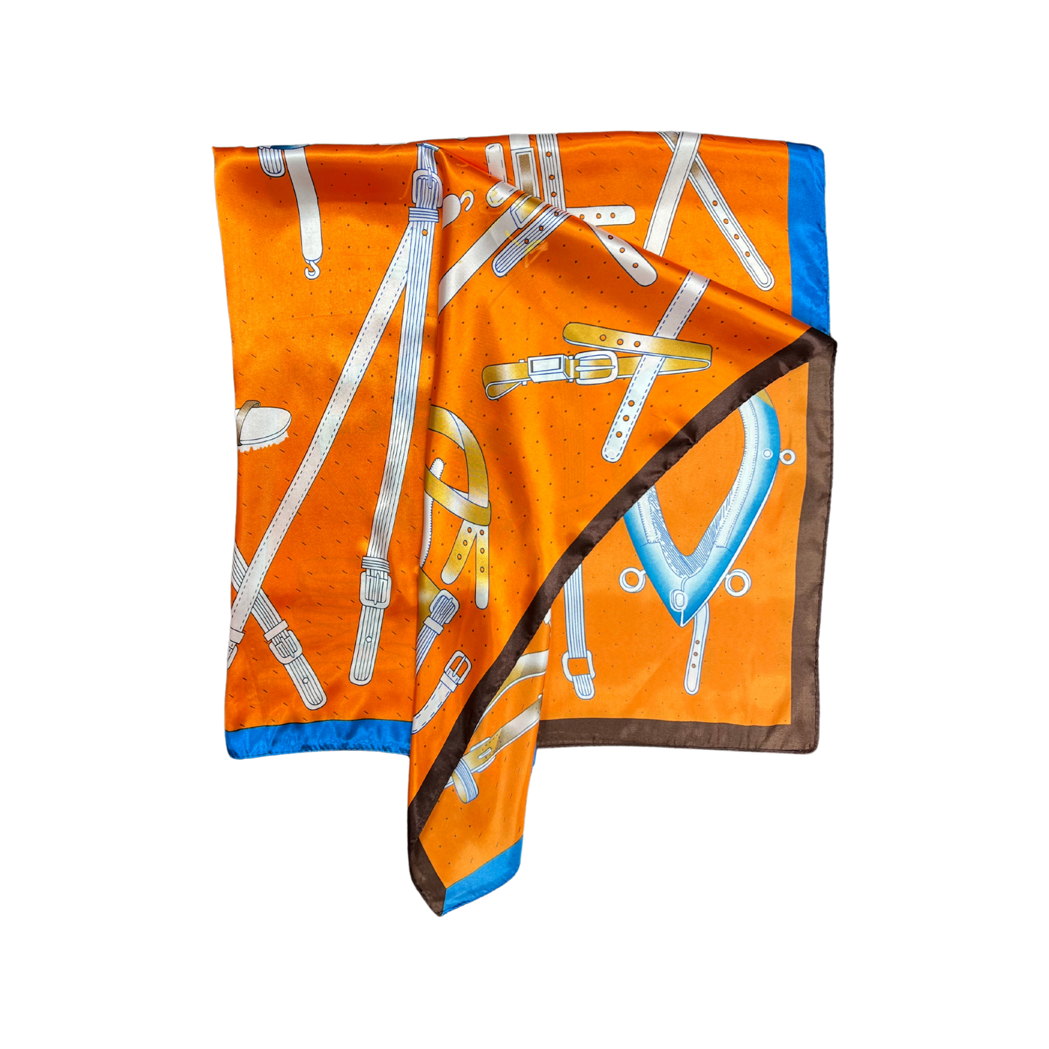 Beautiful silk touch satin square scarf with belt print. The scarf can be worn around the neck, head, and shoulder.