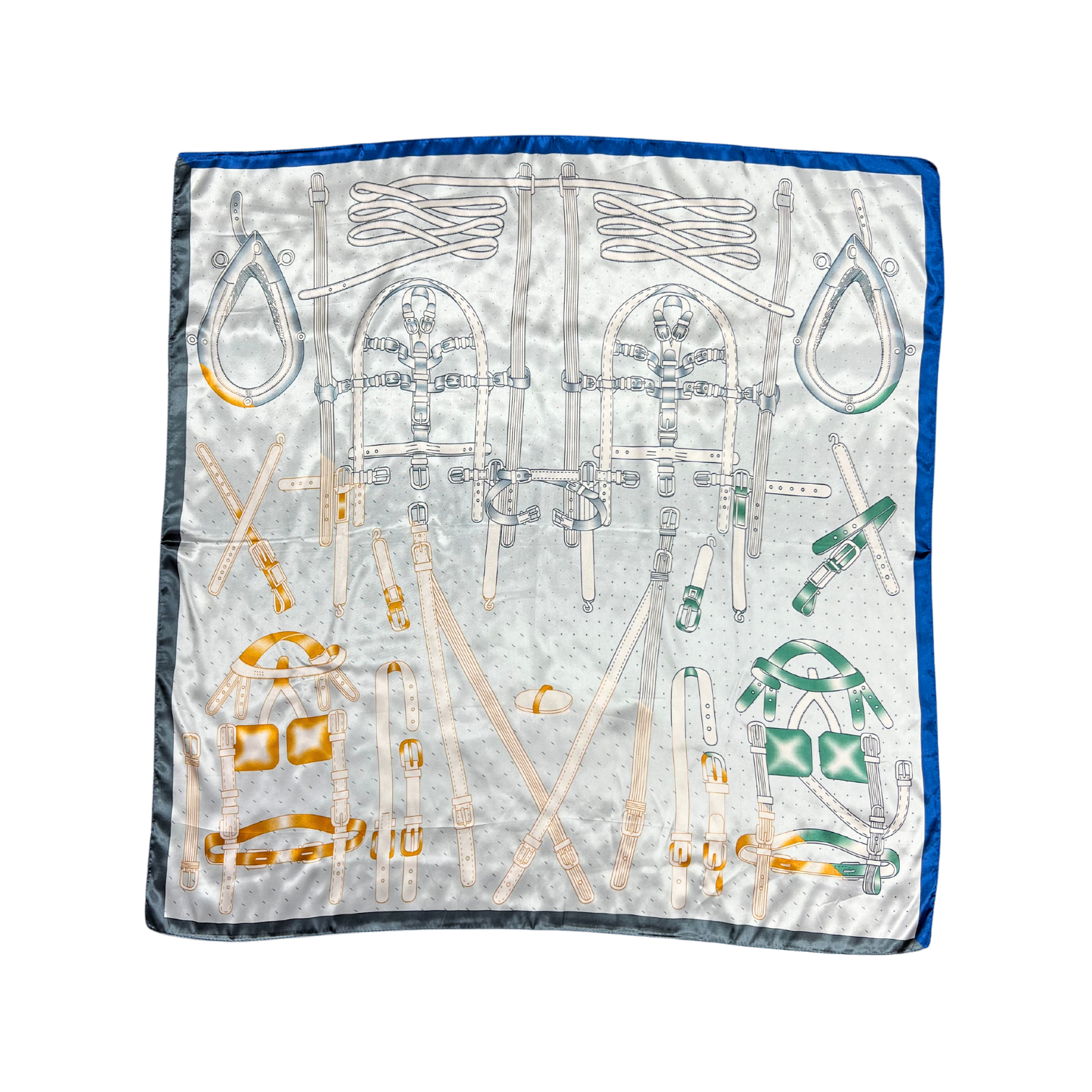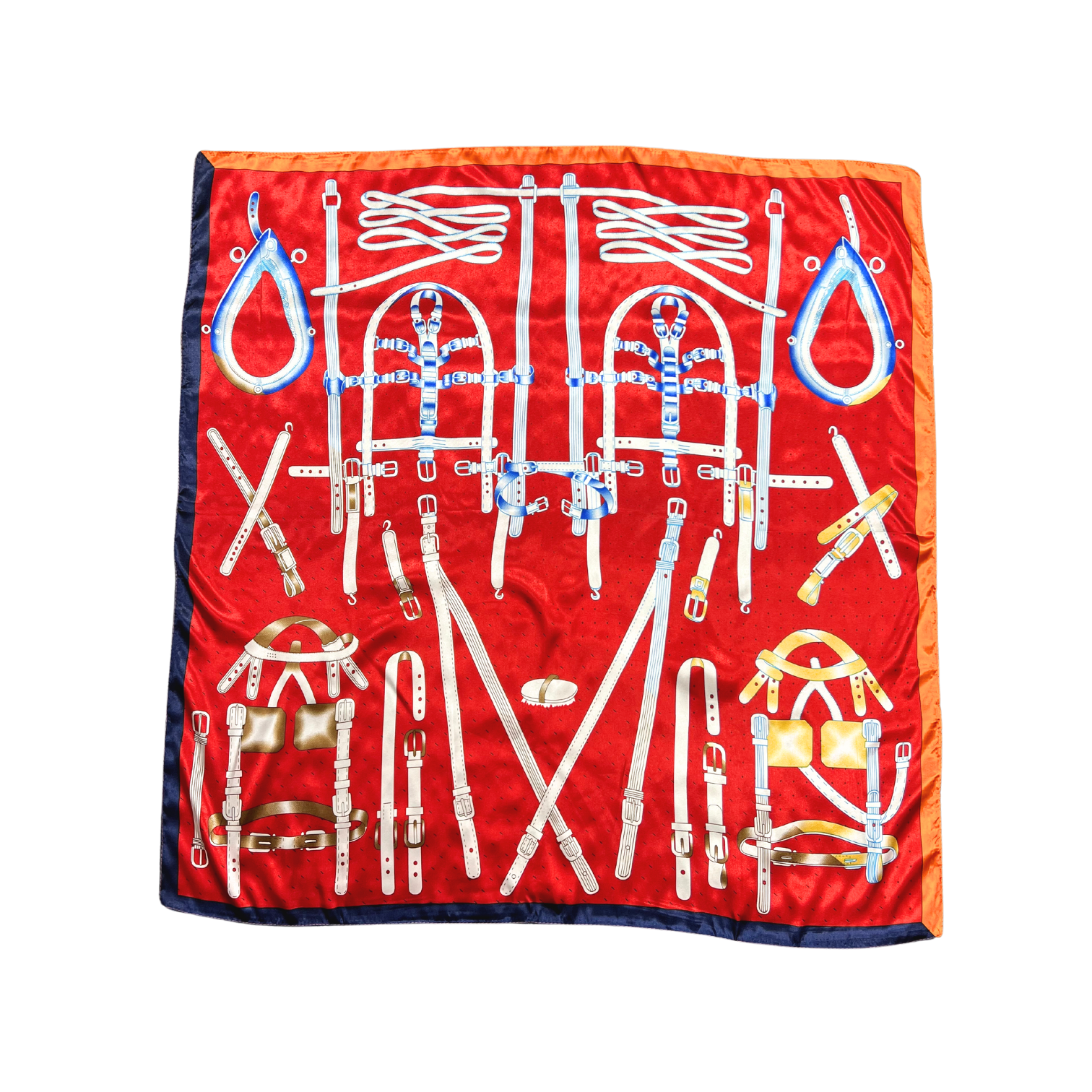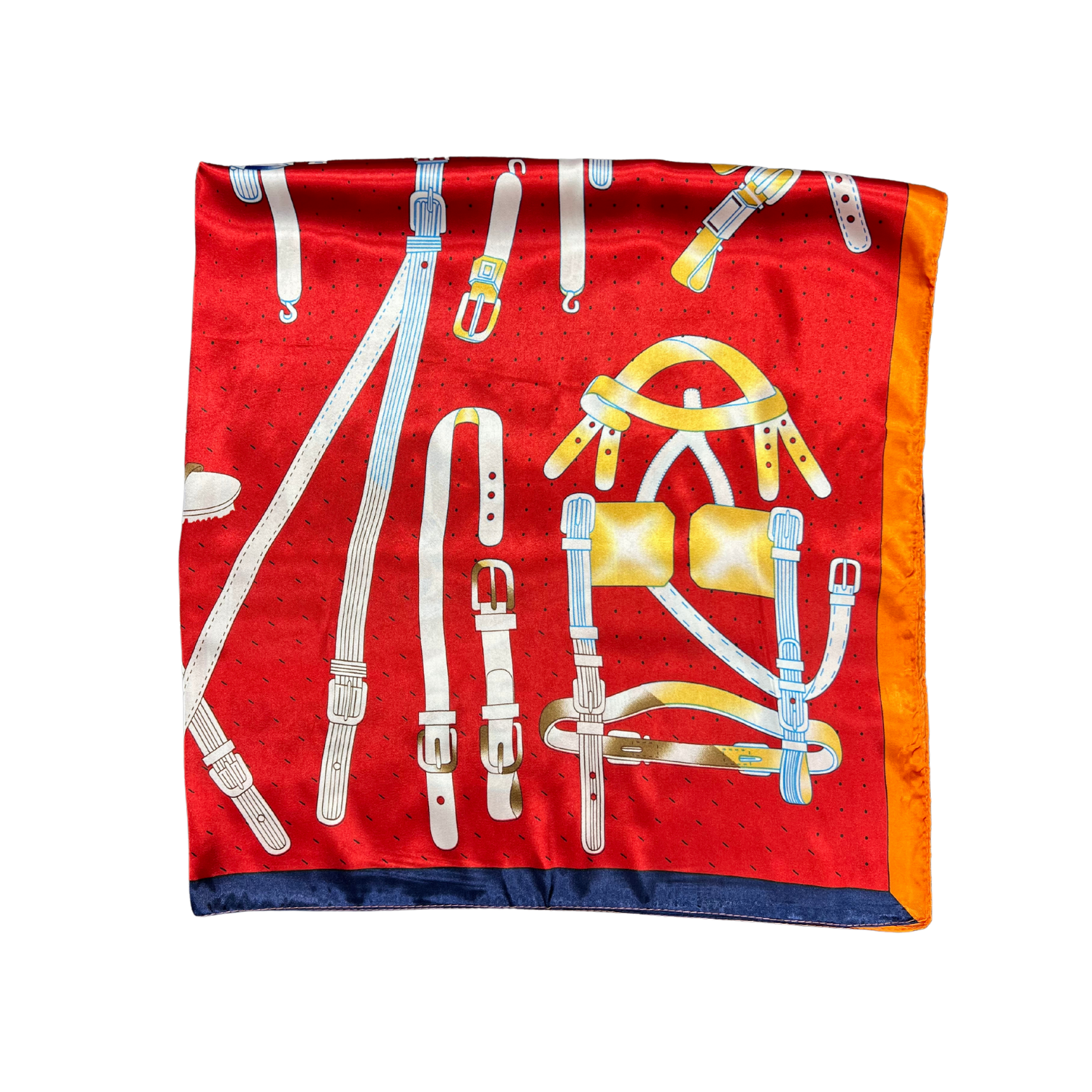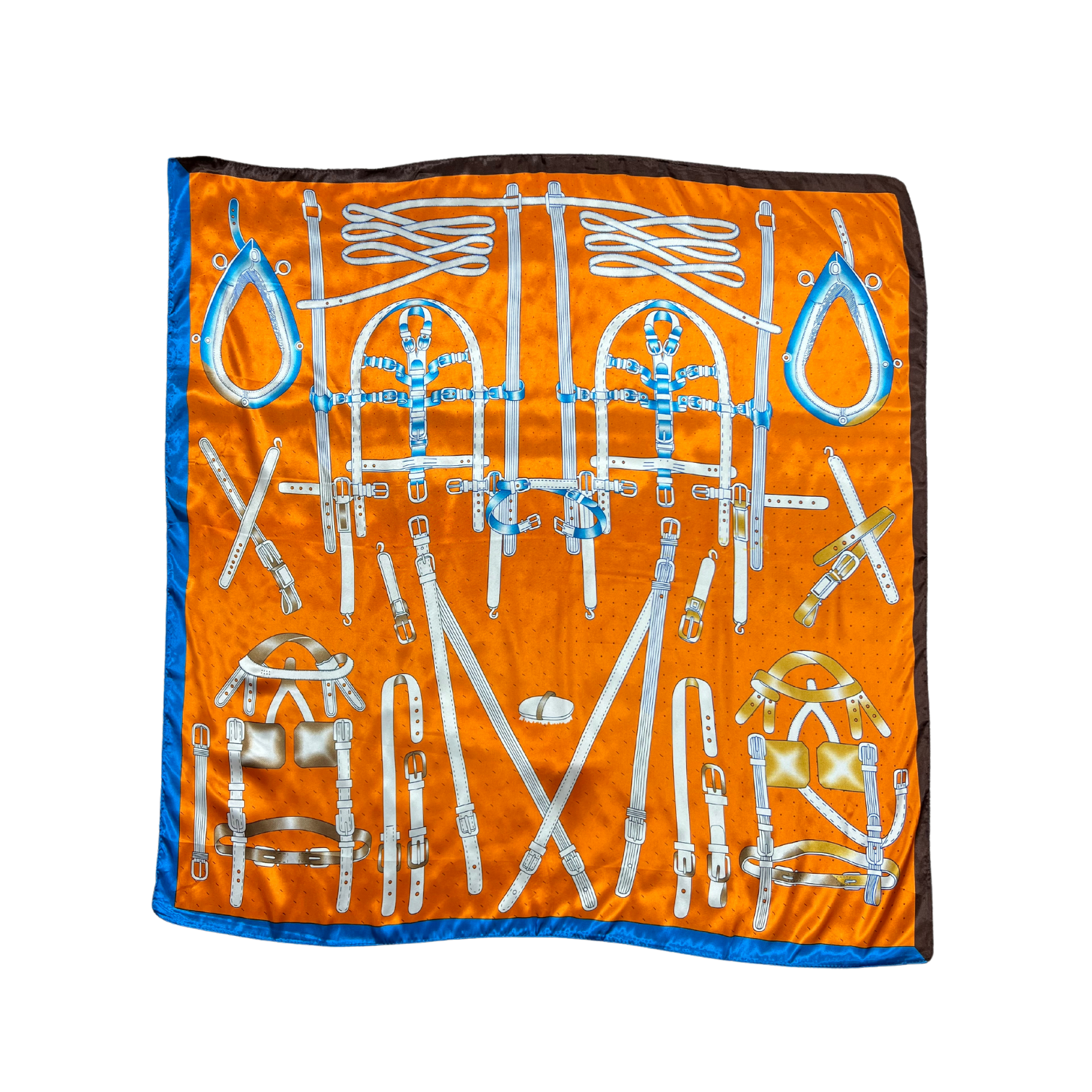 Beautiful silk touch satin square scarf with belt print. The scarf can be worn around the neck, head, and shoulder.