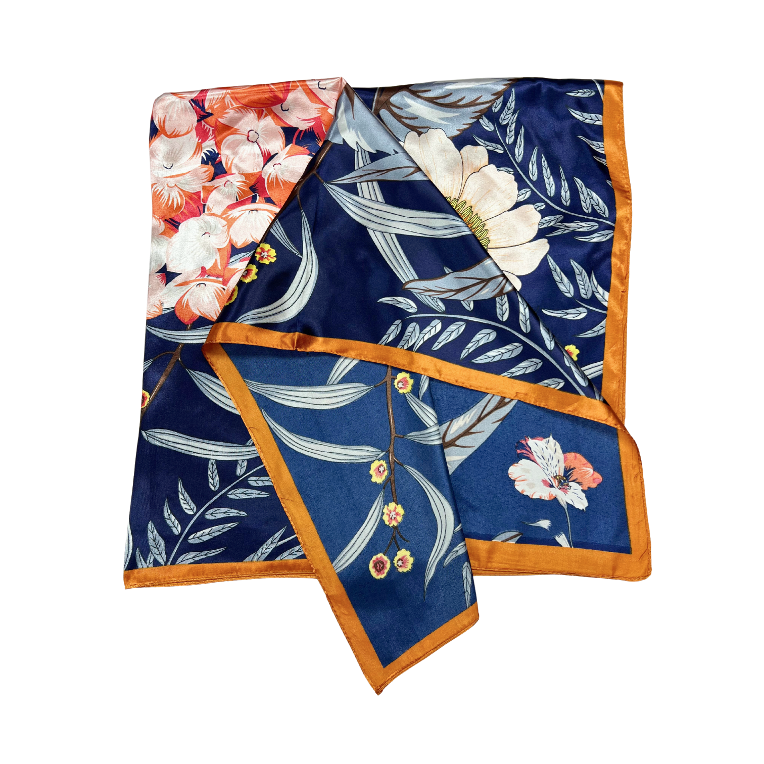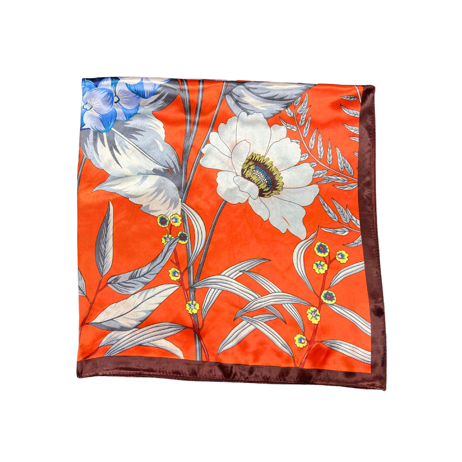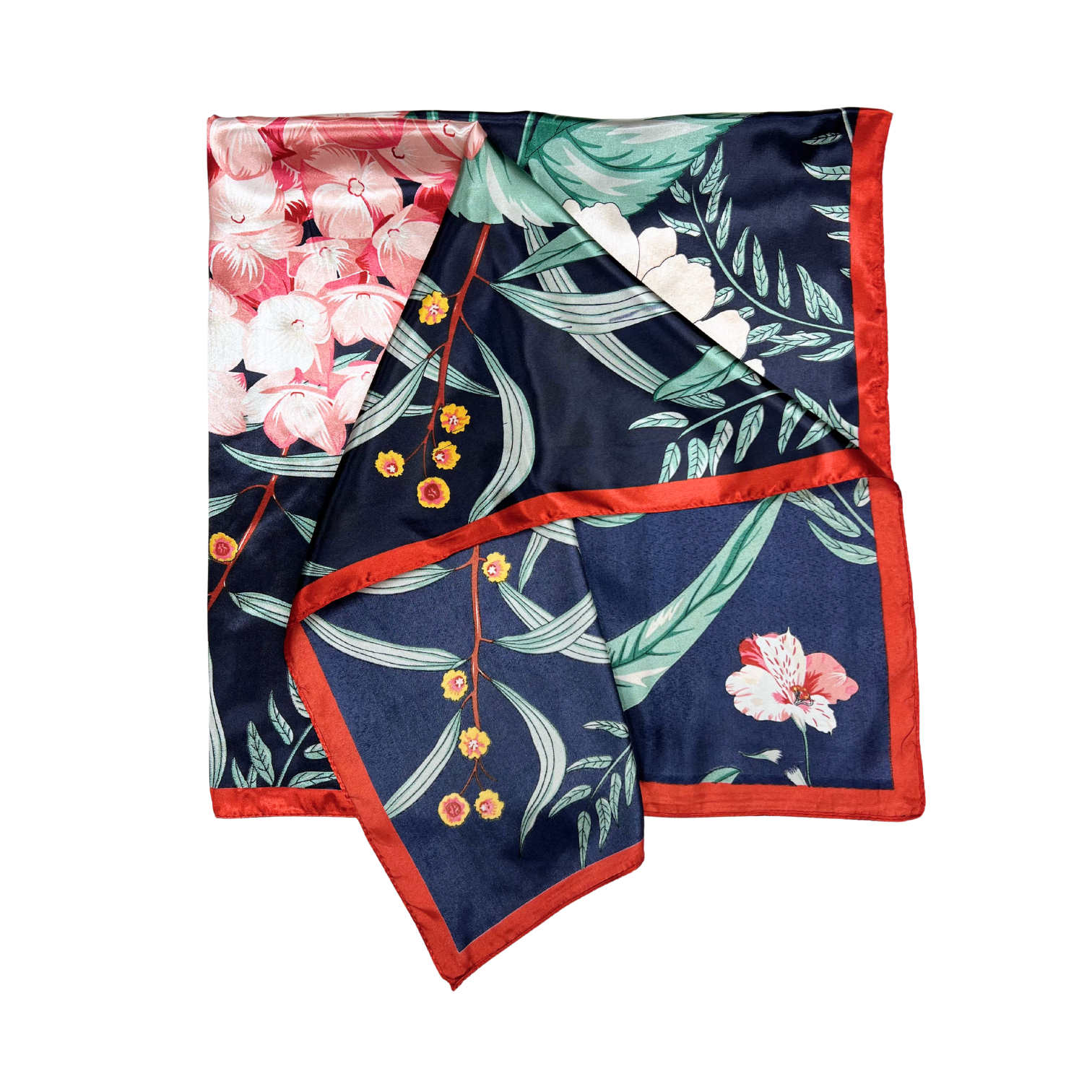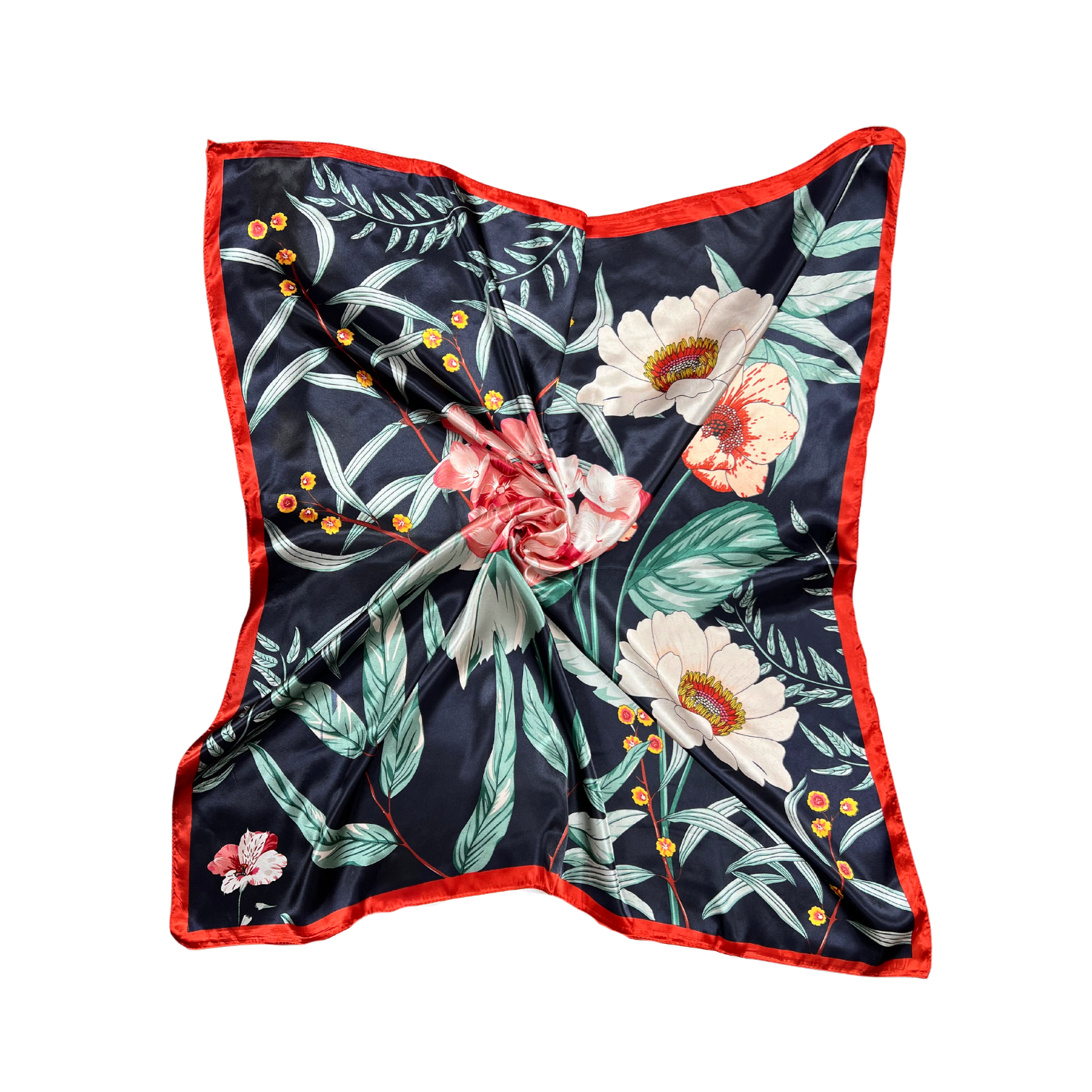 Beautiful silk touch satin square scarf with botanic floral print. The scarf can be worn around the neck, head, and shoulder.