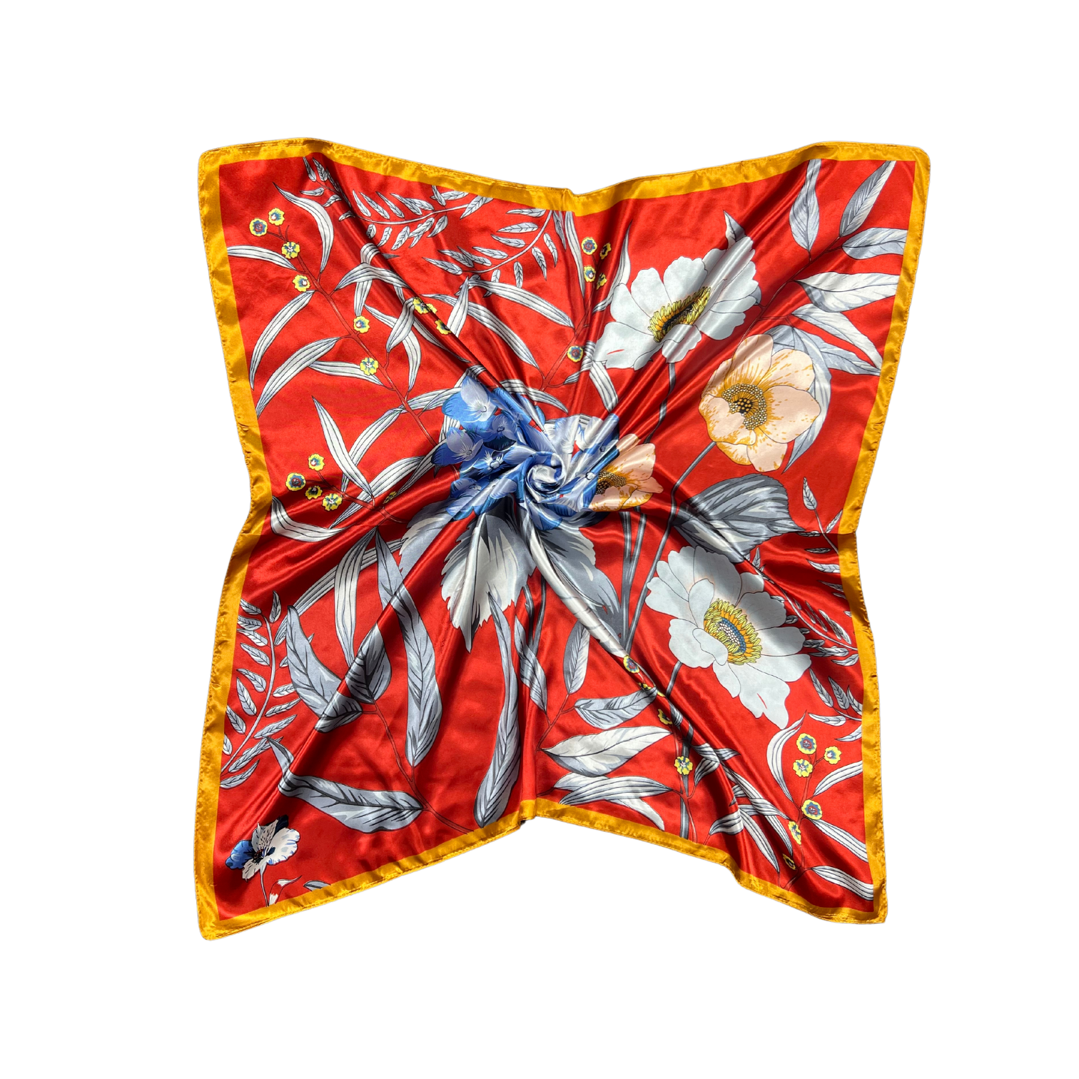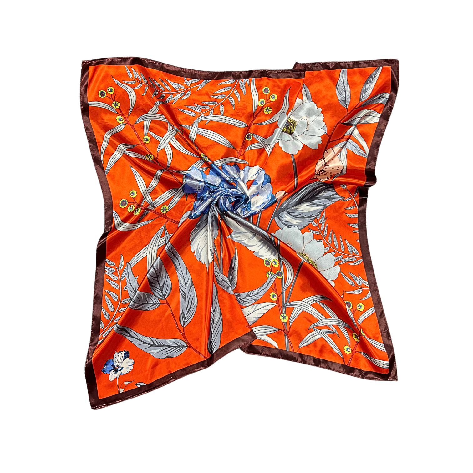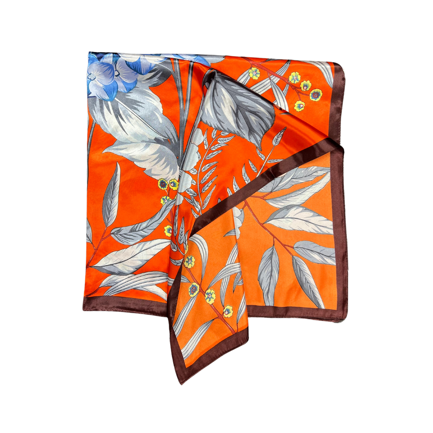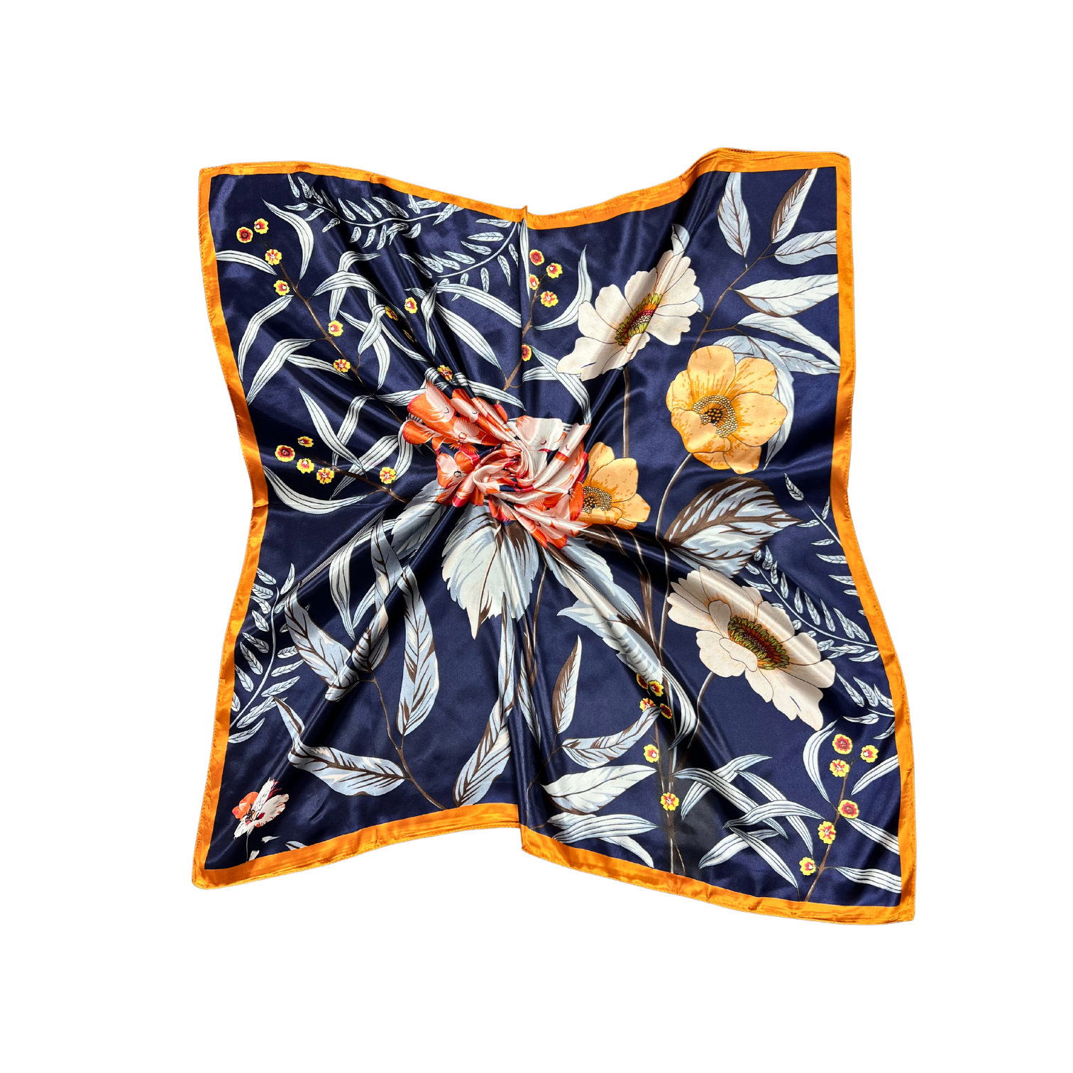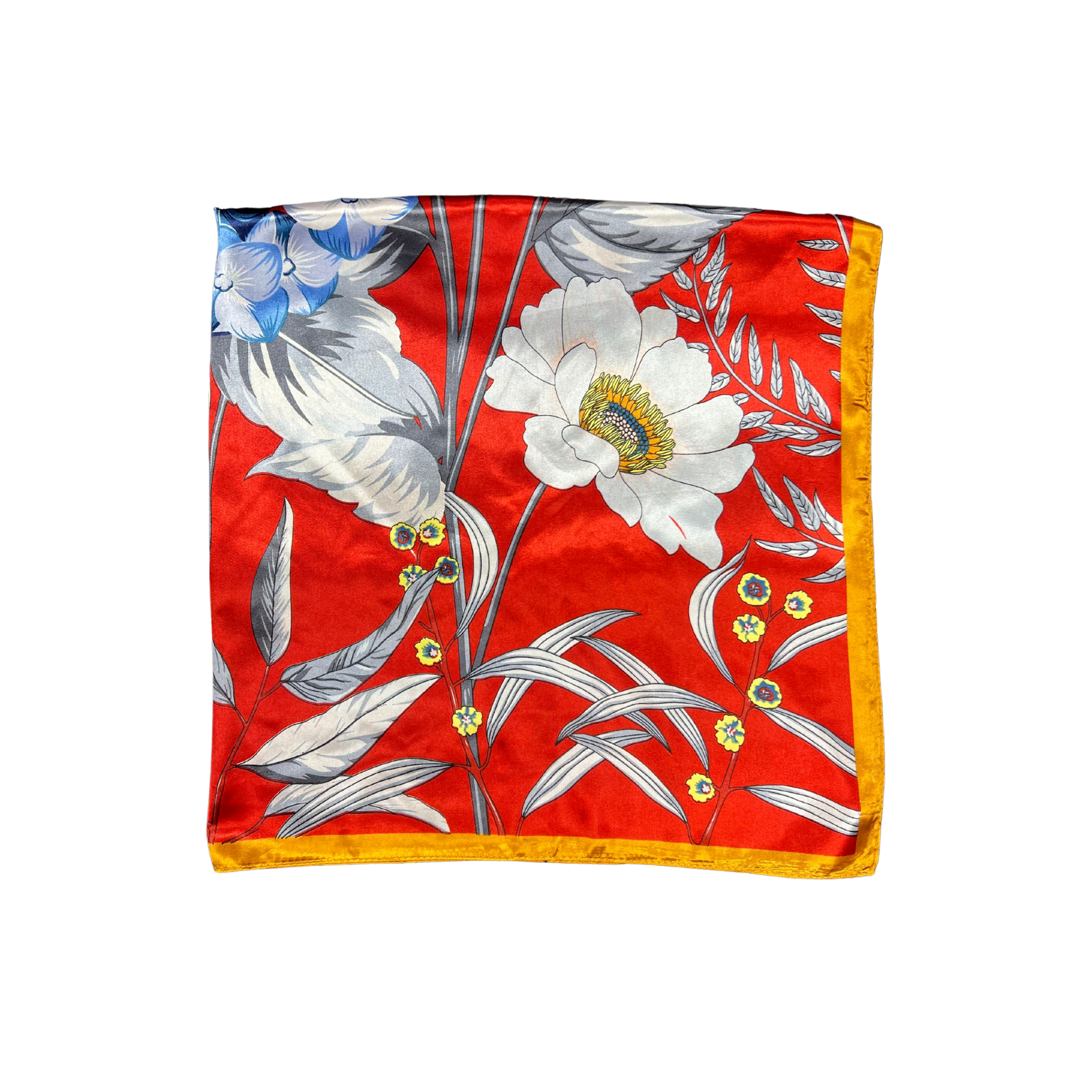 Beautiful silk touch satin square scarf with botanic floral print. The scarf can be worn around the neck, head, and shoulder.