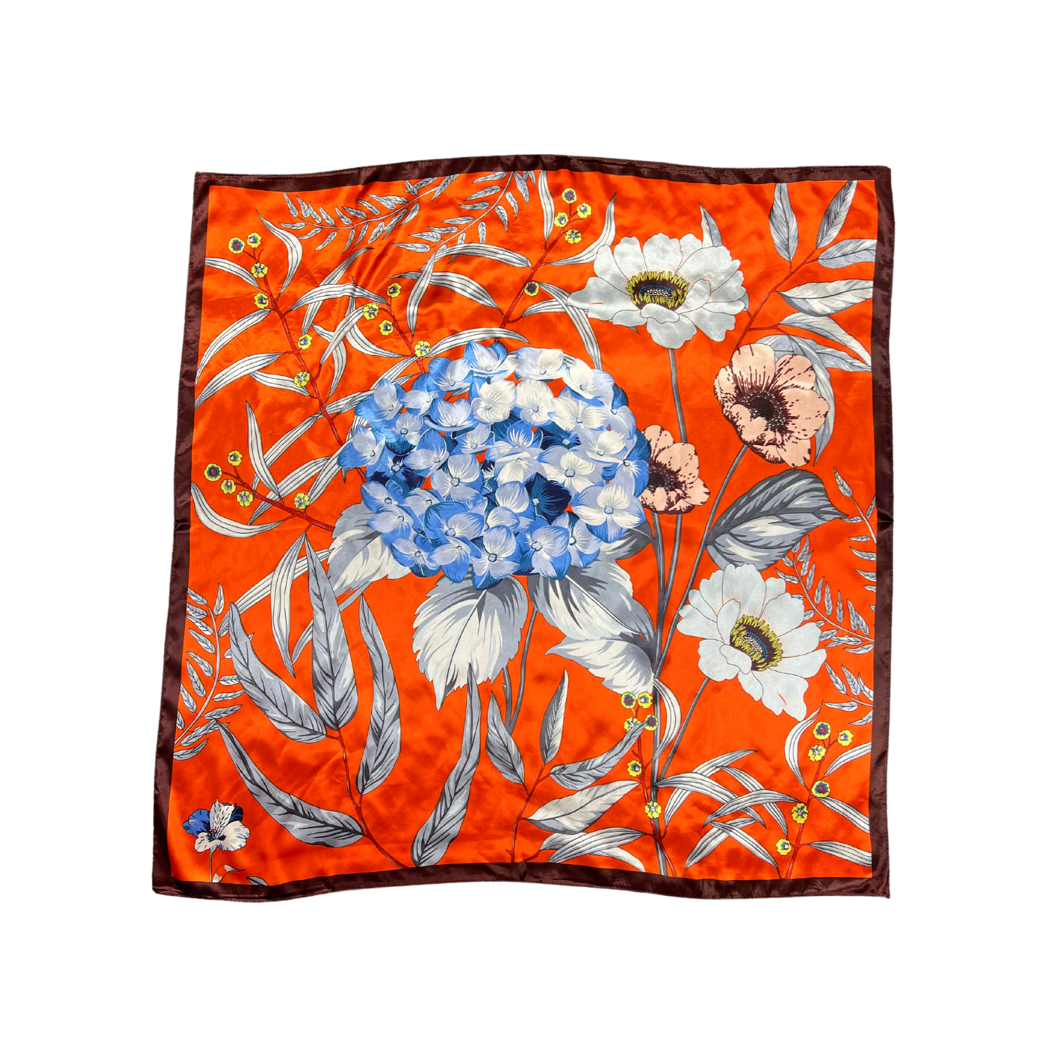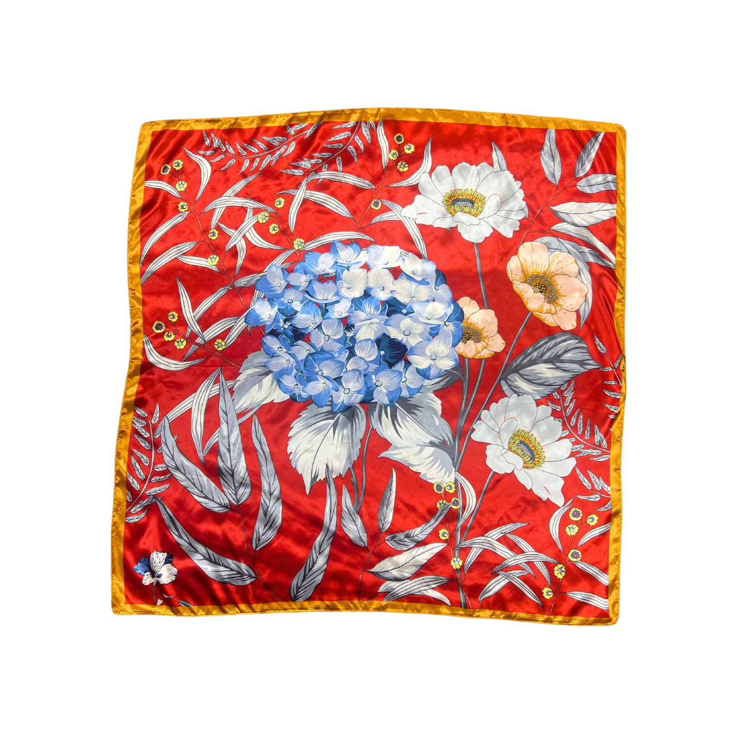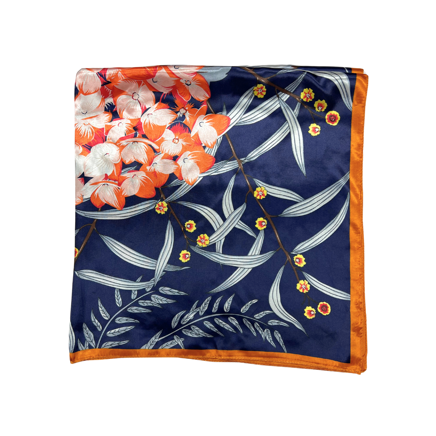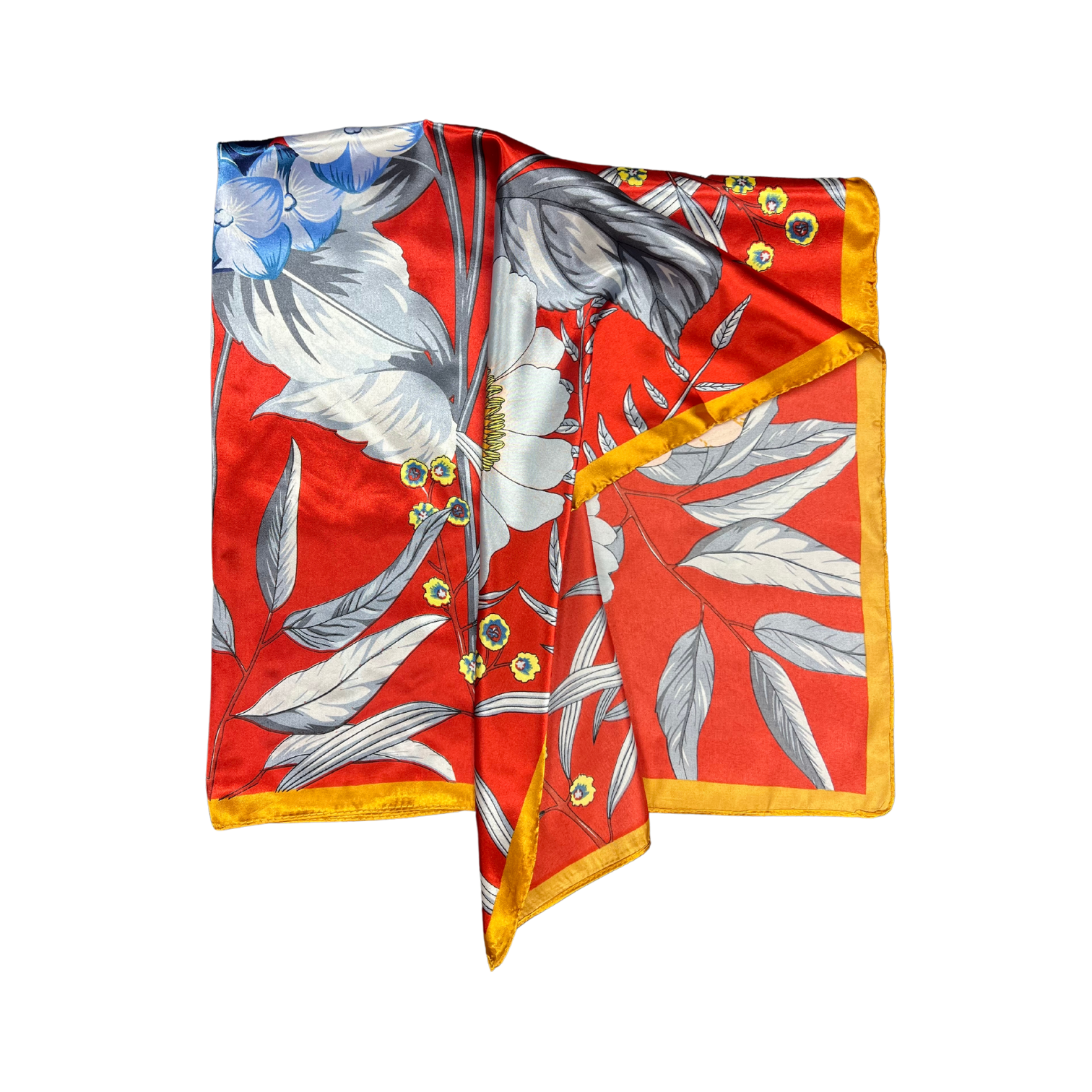 Beautiful silk touch satin square scarf with botanic floral print. The scarf can be worn around the neck, head, and shoulder.