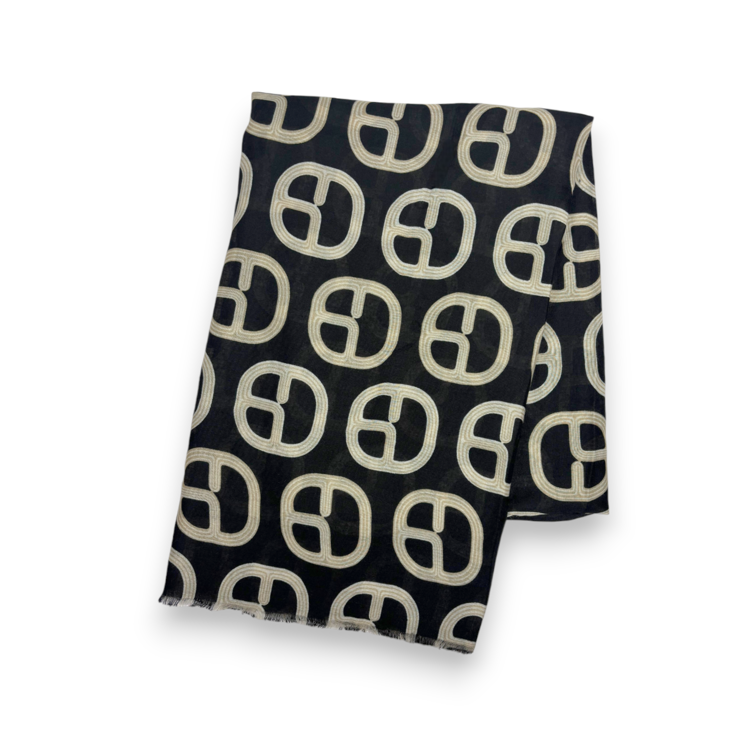 The Chain Print Scarf has fringes on each end of the scarf. Made of 50% cotton and 50% viscose, this scarf feels extremely soft and drapes elegantly. Versatile and timeless piece that can be worn all year round. Available in three colors.