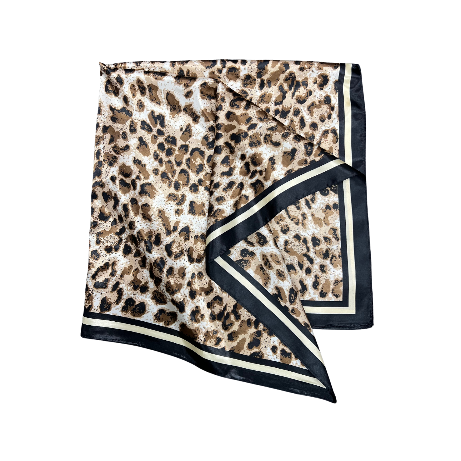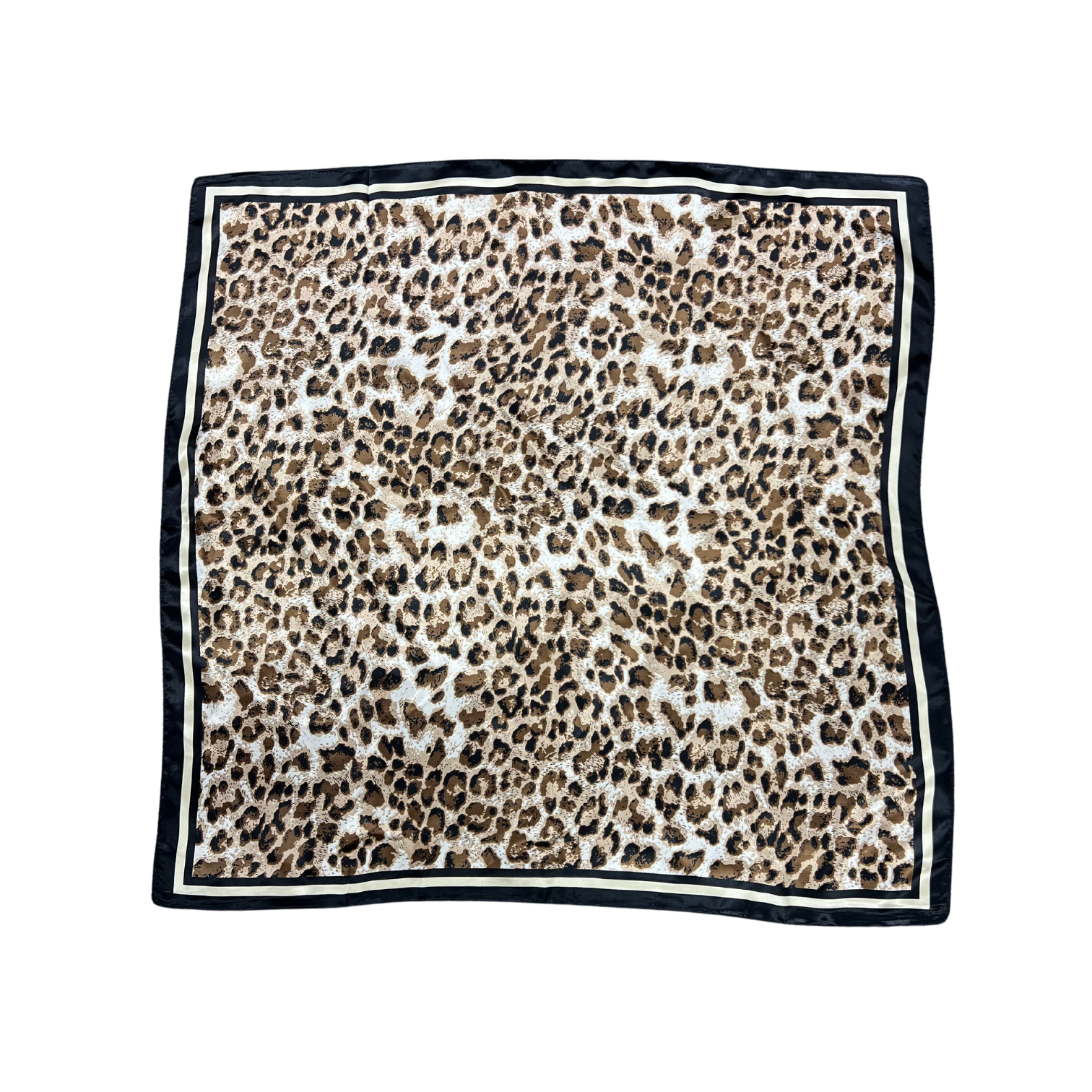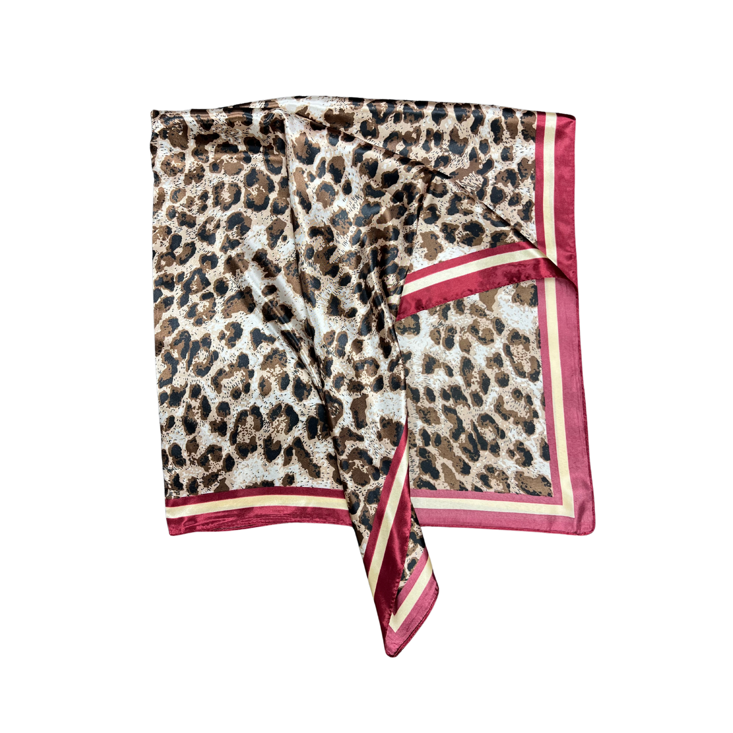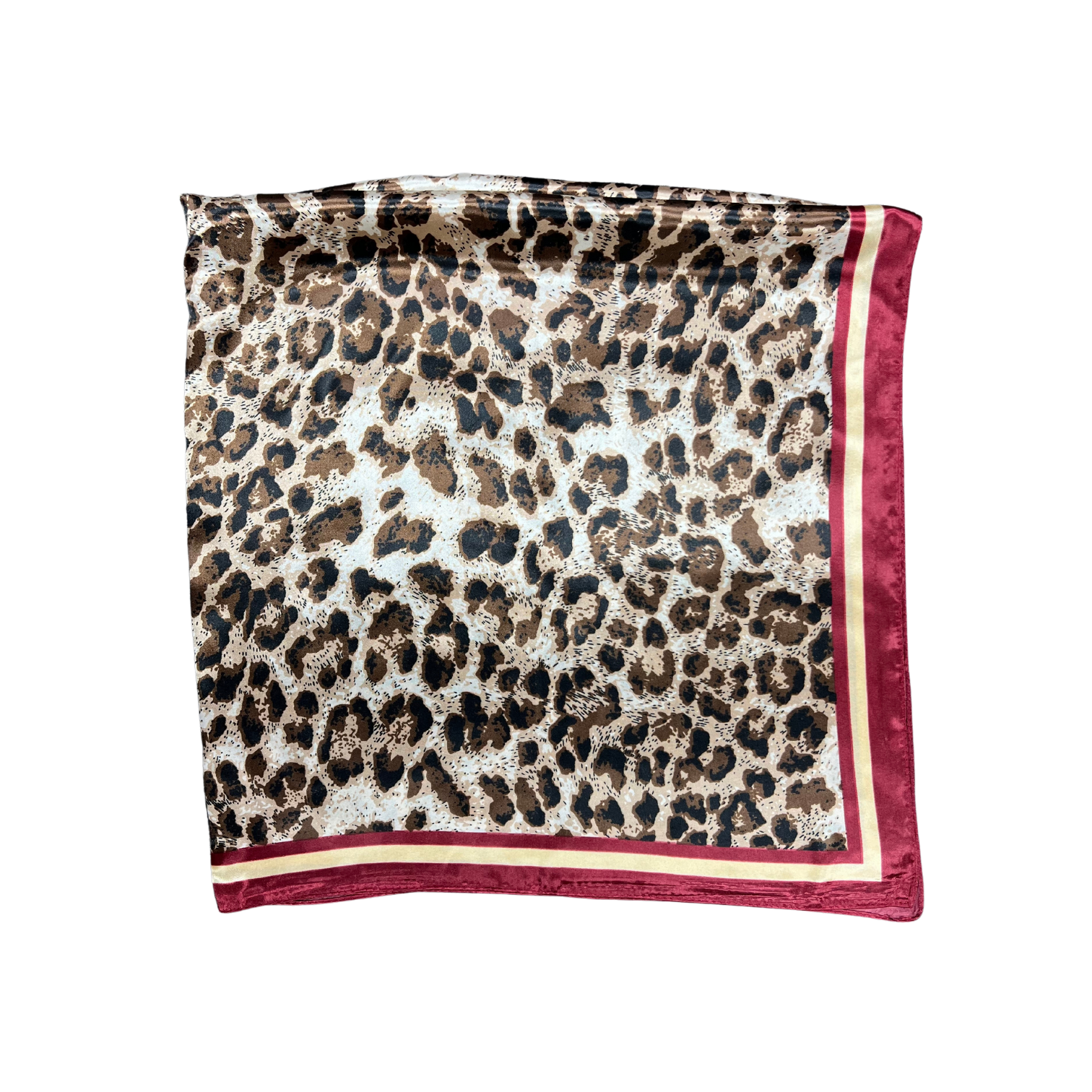 Beautiful silk touch satin square scarf with cheetah print. The scarf can be worn around the neck, head, and shoulder.