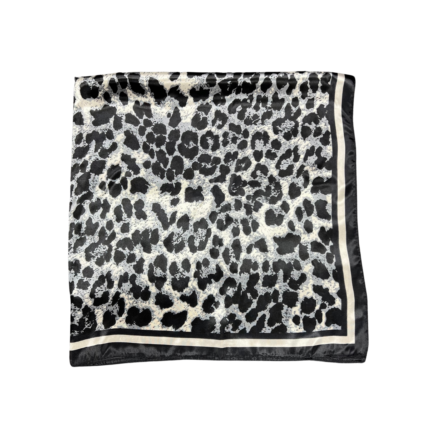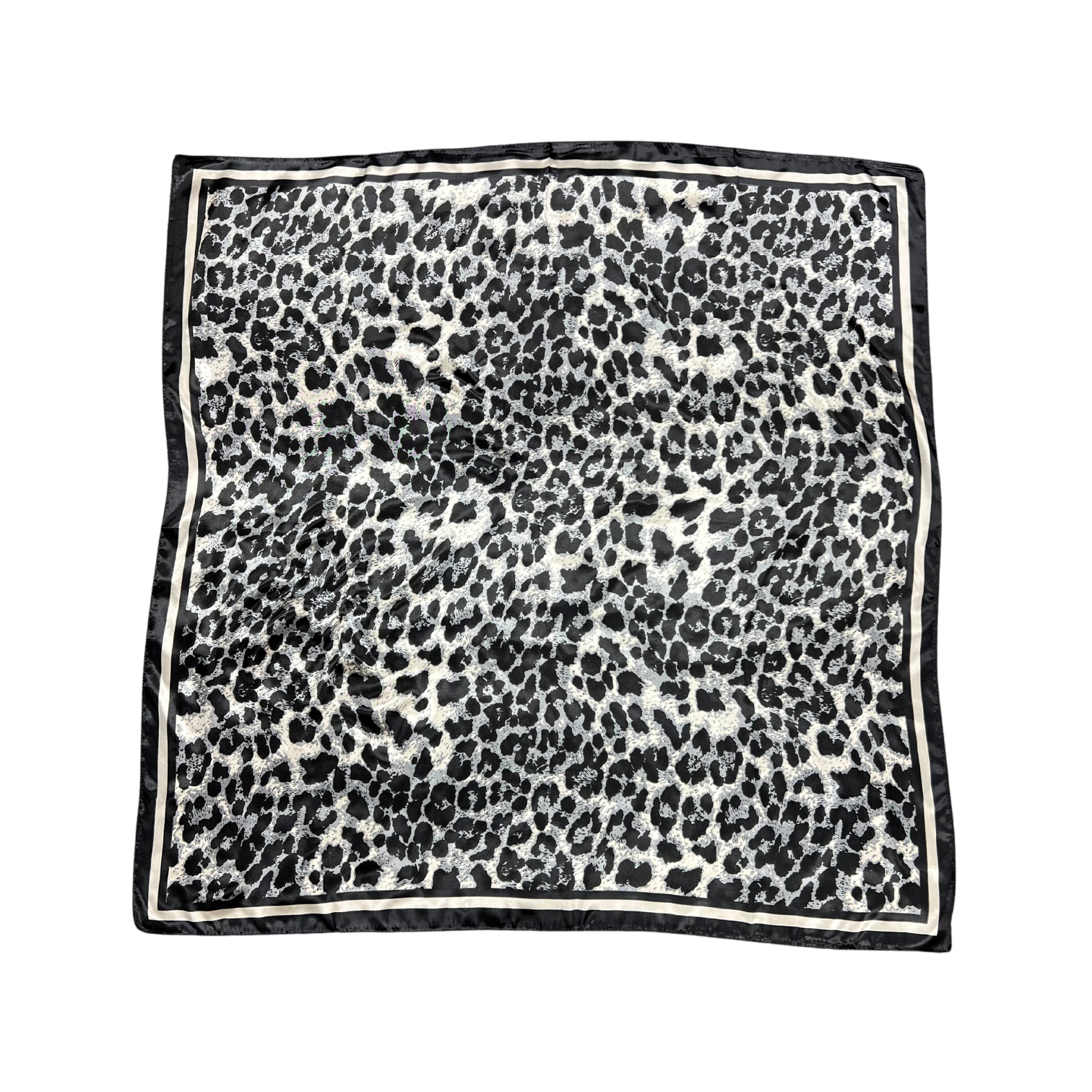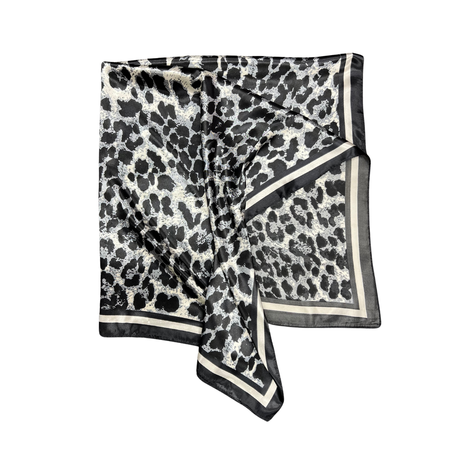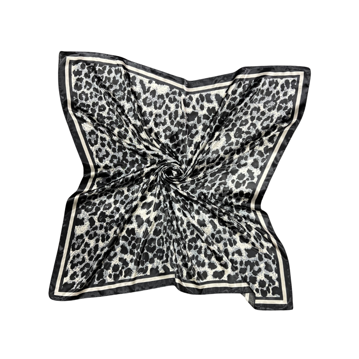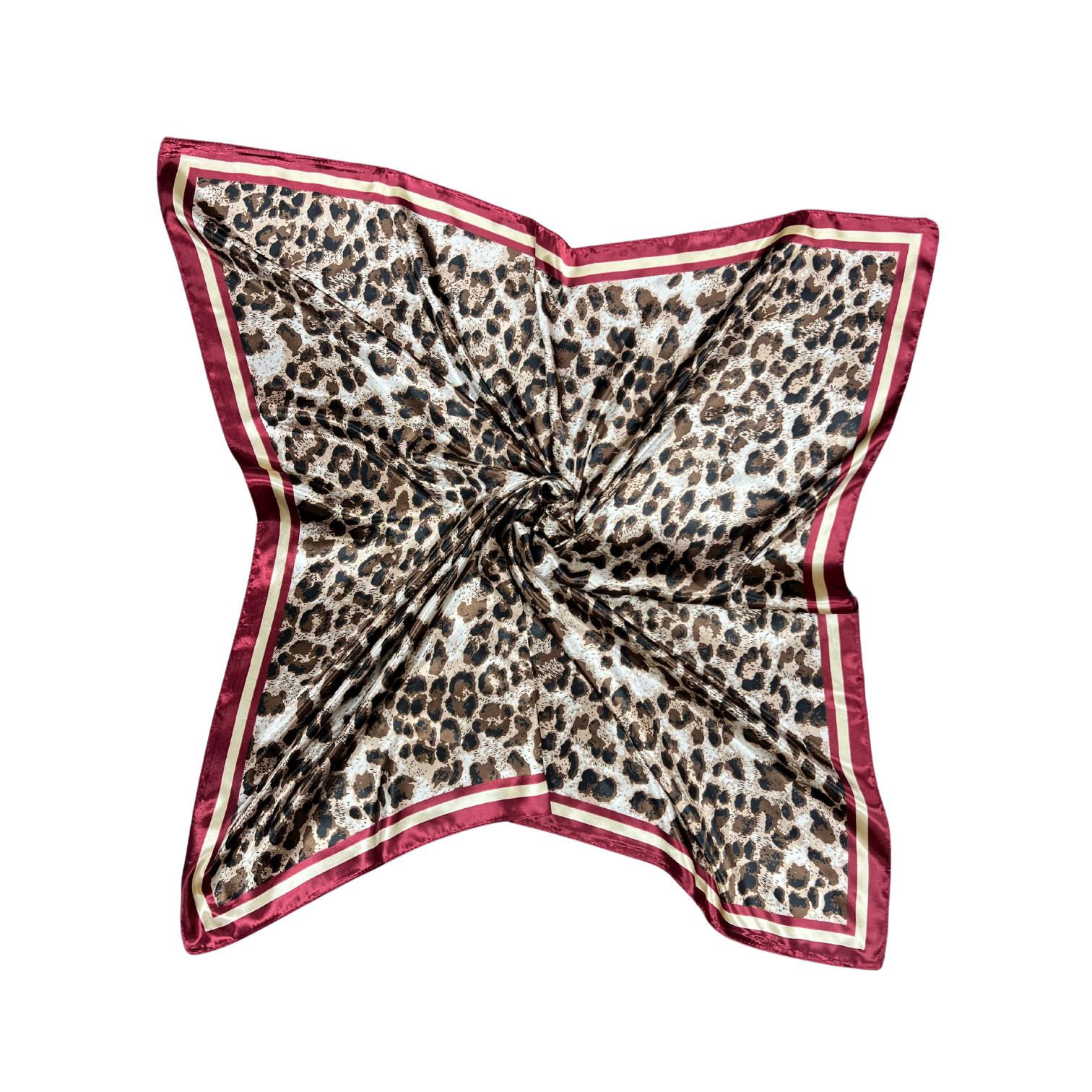 Beautiful silk touch satin square scarf with cheetah print. The scarf can be worn around the neck, head, and shoulder.