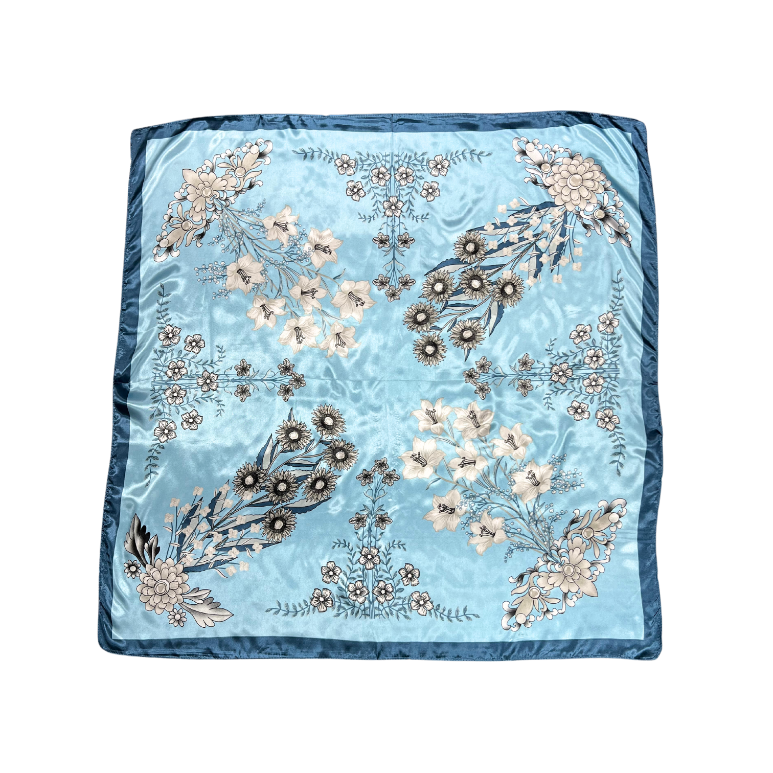 Beautiful silk touch satin square scarf with multi-floral print. The scarf can be worn around the neck, head, and shoulder.